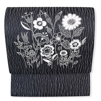 独特の節を織り込んだ味わい深い帯地に、厳選された数色で繊細な更紗を描いた上質な一本です。細かな地紋の陰影と金の縁取りが重厚感を生み出し、シックな装いに。それでいてふんわりと軽い帯地なのでどっしりと重くなりすぎず着姿に寄り添います。