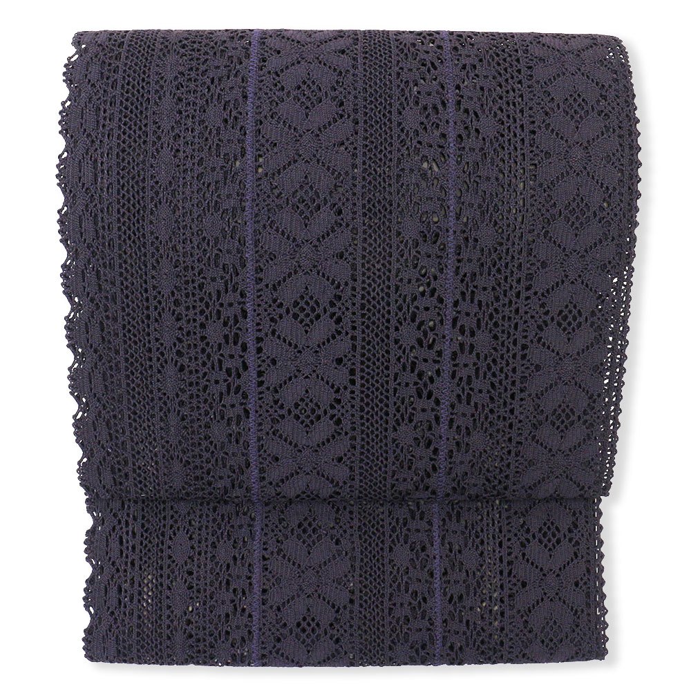 総レースが印象的なこちらは、芯なし・かがり縫いの平仕立て帯です。お太鼓部分のみが袋状になっている単衣帯かつ、レースの素材感が相まって大変軽やかな仕上がりに。透け感があるため、浴衣や単衣~夏着物との相性が良く、いつもとは違うコーディネートを演出してくれるでしょう。甘すぎないデザインと、優しいパープル系の配色で使いやすいのもポイント◎小物合わせを考える時間も楽しくなりそうです。