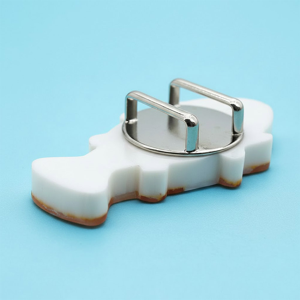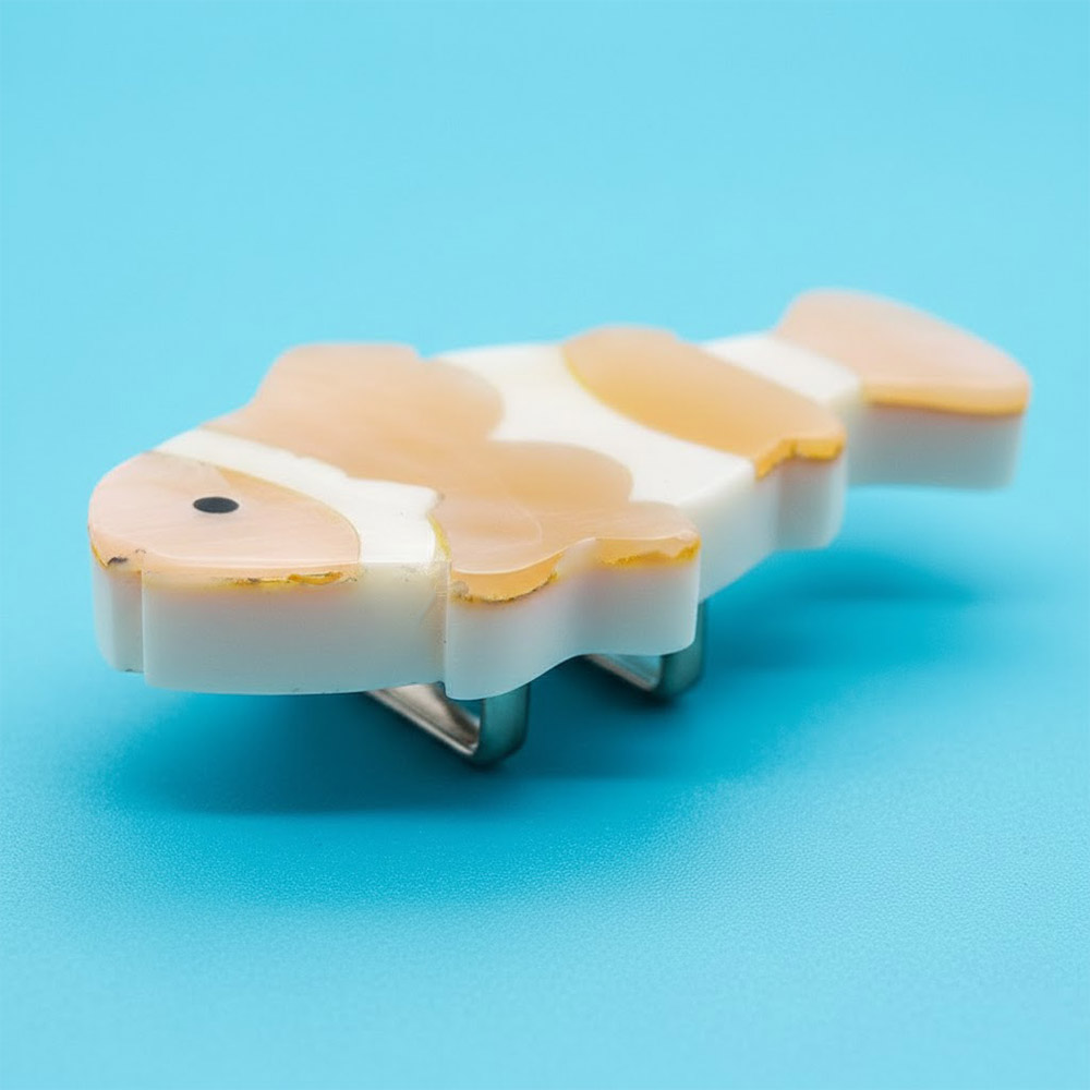 貝を使用し、温もりがあふれるアイテムを創り出す【リオン工芸】による、カクレクマノミを象った貝帯留。