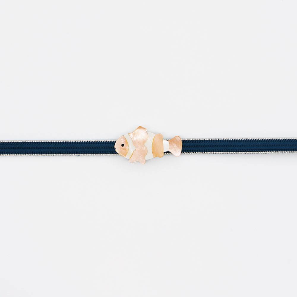 貝ならではの奥深い光沢と彩りが帯留に幾重もの表情を与え、素材本来の美しさを感じていただける逸品です。まるで海の中を泳いでいるような神秘的な色彩でありながら、丸みを帯びたカクレクマノミが可愛らしく、帯元にそっとなじむような優しい仕上がり。