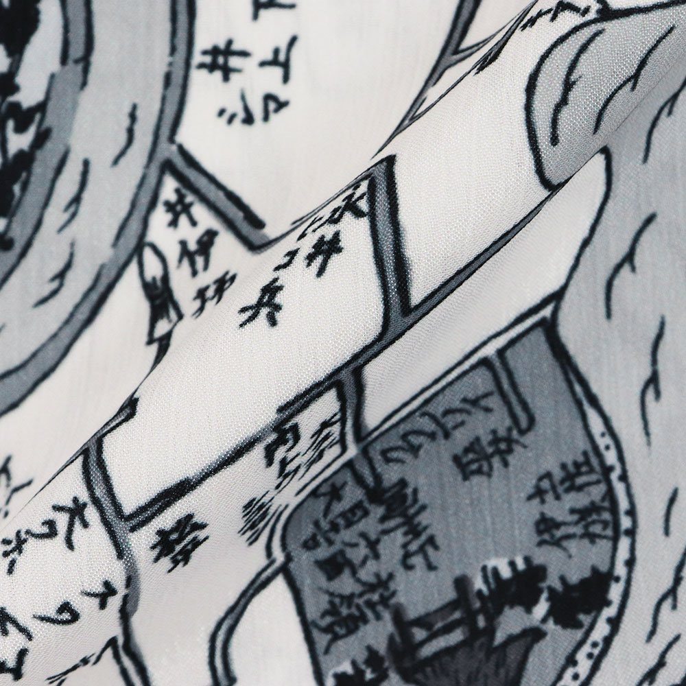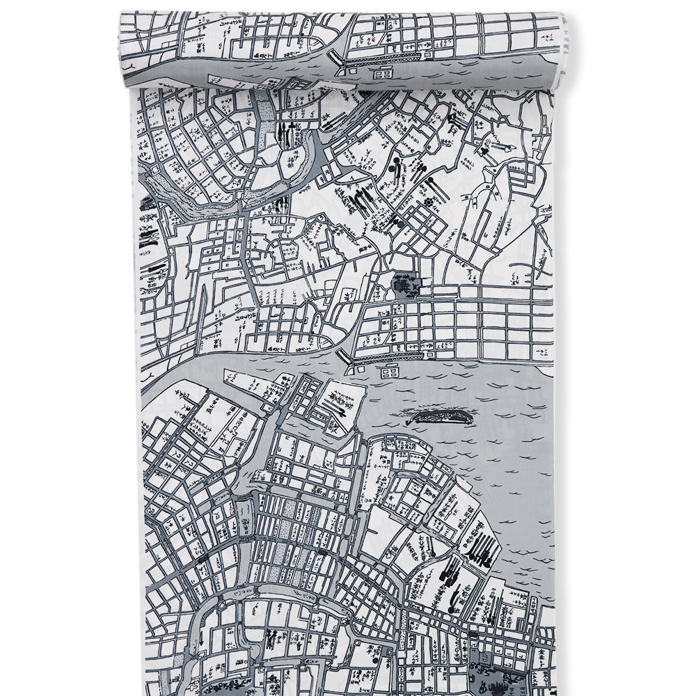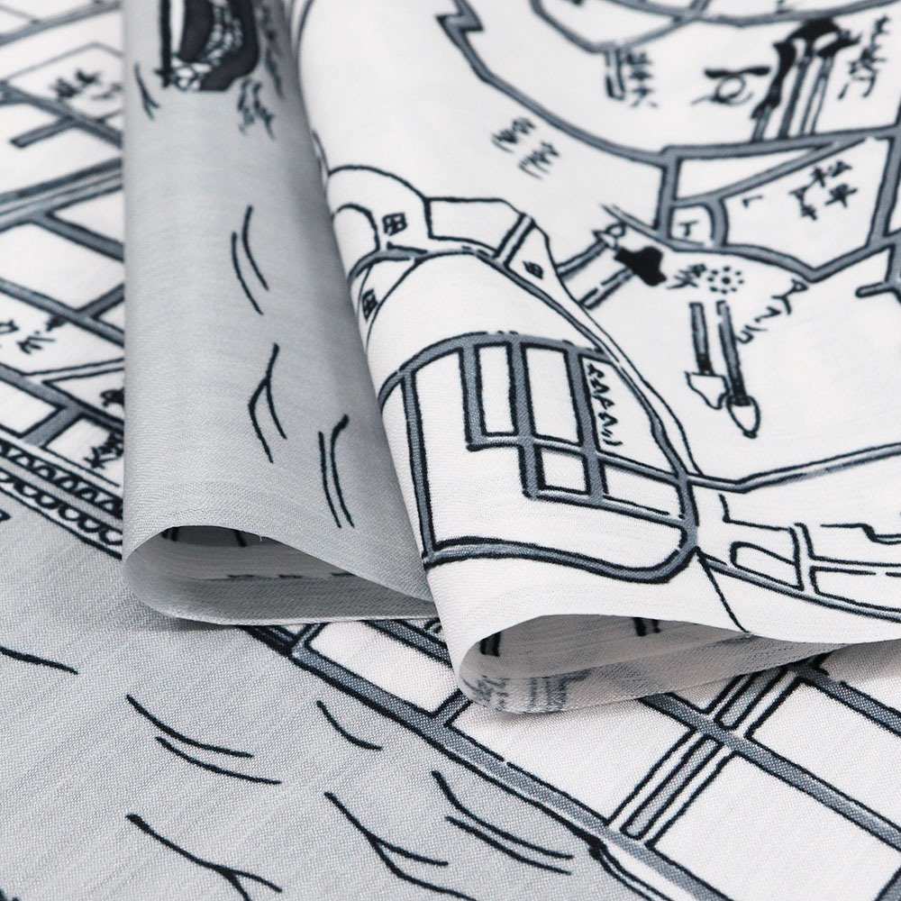 古地図柄が粋なデザインです。グレーを基調とした色合いはクールな印象に。個性的な柄行きは袖口等からチラリと覗いた時にも気分が上がりそうです。