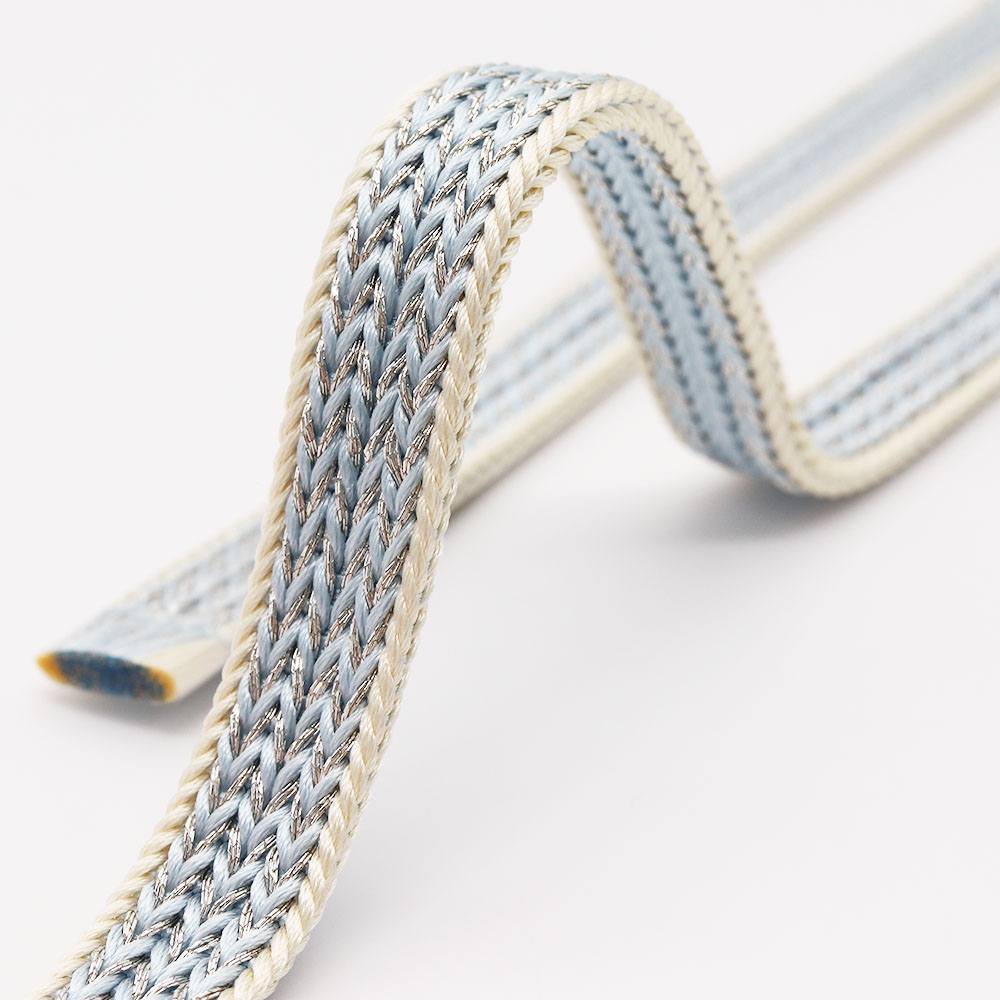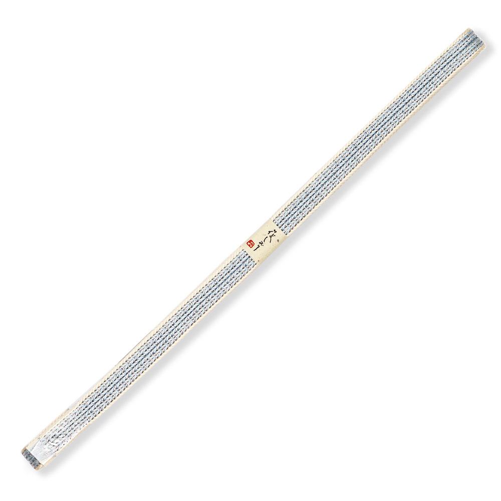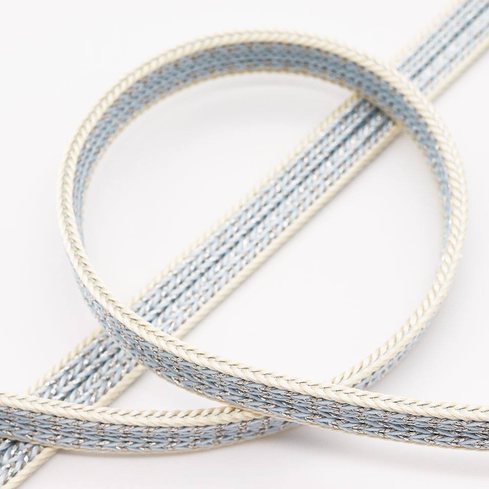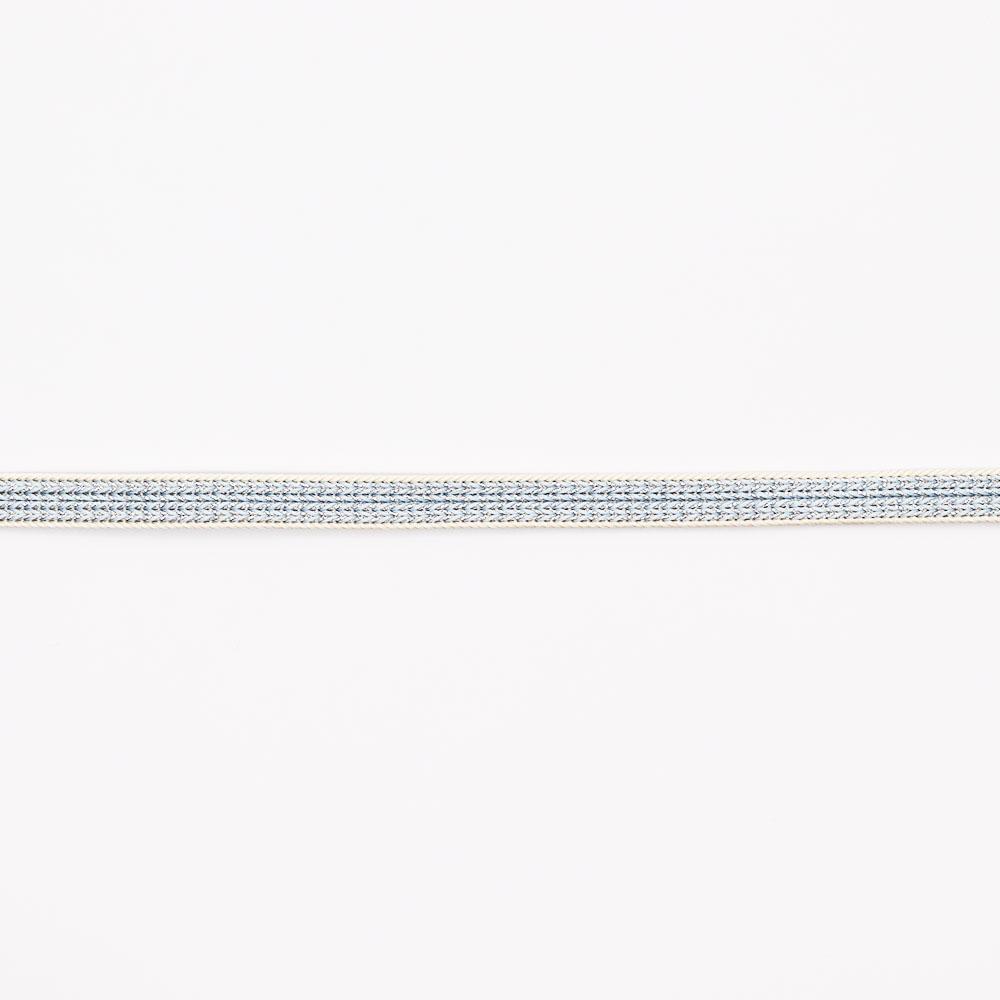 張りを持たせながらもキュッと締めやすく、凹凸が少ないので帯留も通しやすい一本。空色とベージュのやわらかなカラーに銀糸が織り込まれ、シンプルながら華やかな印象を与えてくれます。スリムなデザインもあいまって、コーディネートを程よく引き締めてくれること間違いなし◎