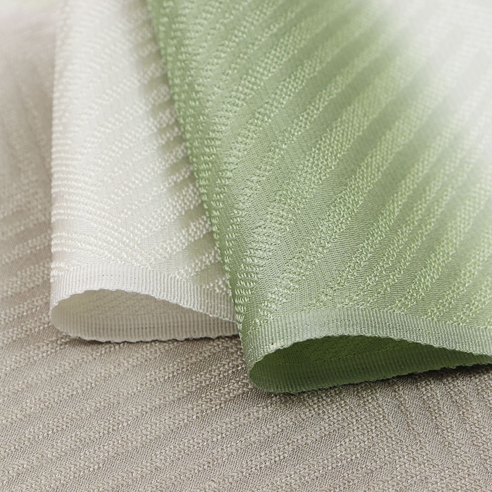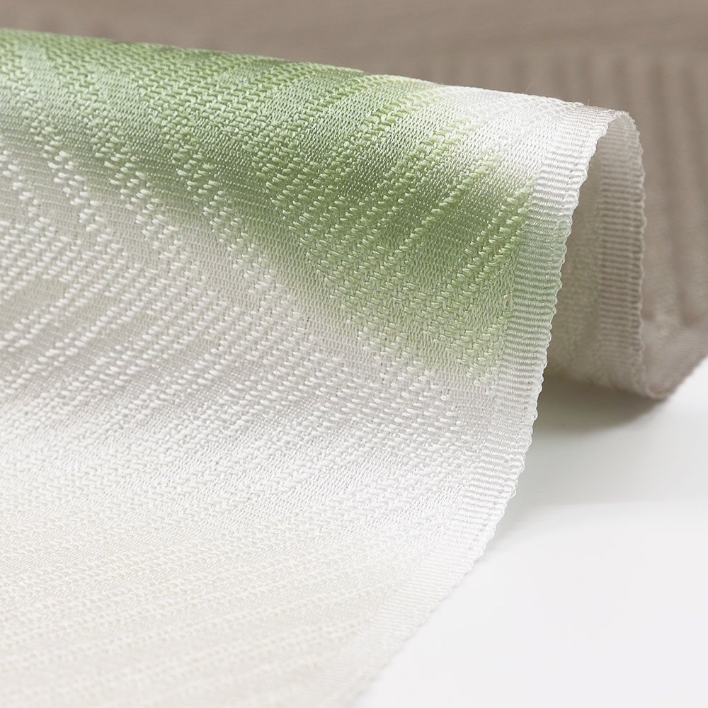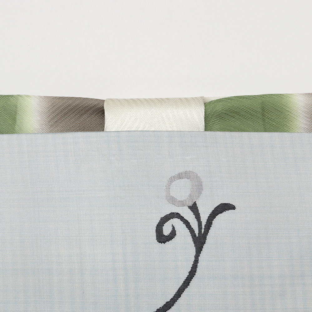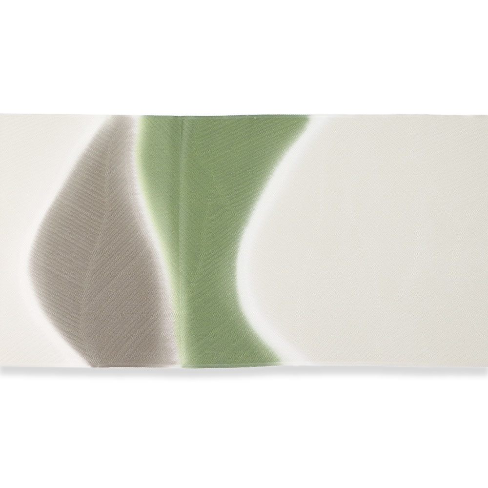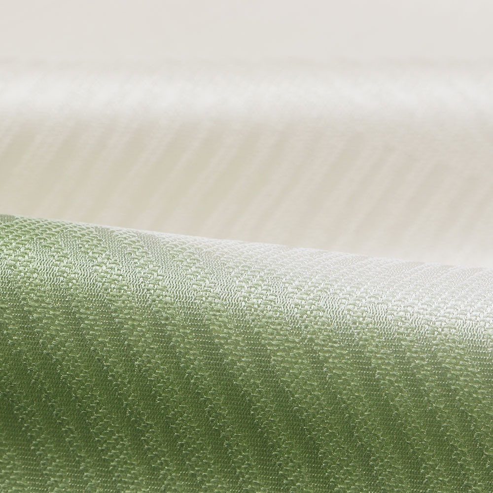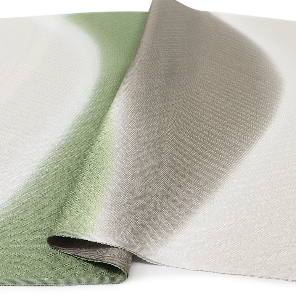 ふっくらとした艶感のある斜地紋と、段よろけの柄行が上品な逸品。緑、薄灰、薄茶の色合いは、それぞれ奥深い雰囲気を持ちながら、モダンな配色センスでコーディネートのアクセントとして活躍してくれそう◎