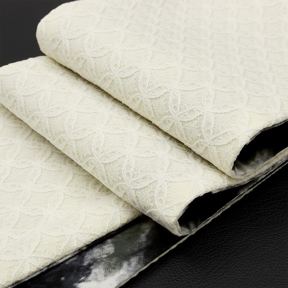 やや厚みのある生地感ですが、重さは気にならない風合いです。ハリがあるので帯の形が崩れにくいのも嬉しいポイント。