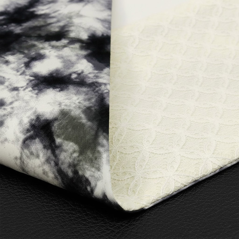 もう片面には、大理石のようなマーブル柄を染めたファブリックを選定。アイボリー×ブルーグレーのコントラストがレースの甘さを抑えた、スパイシーな雰囲気を醸しだします。
