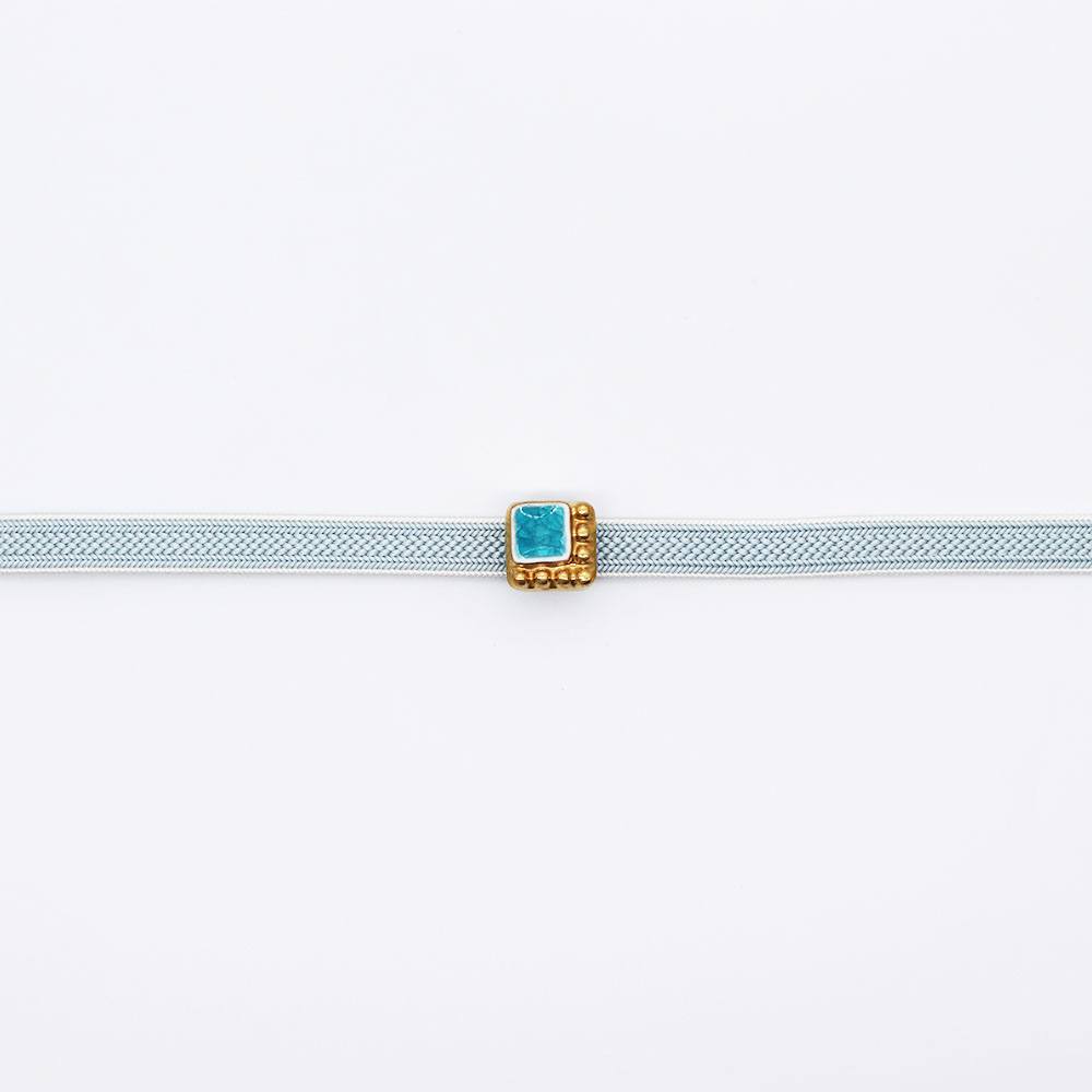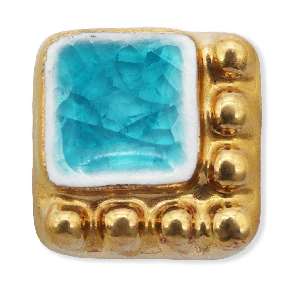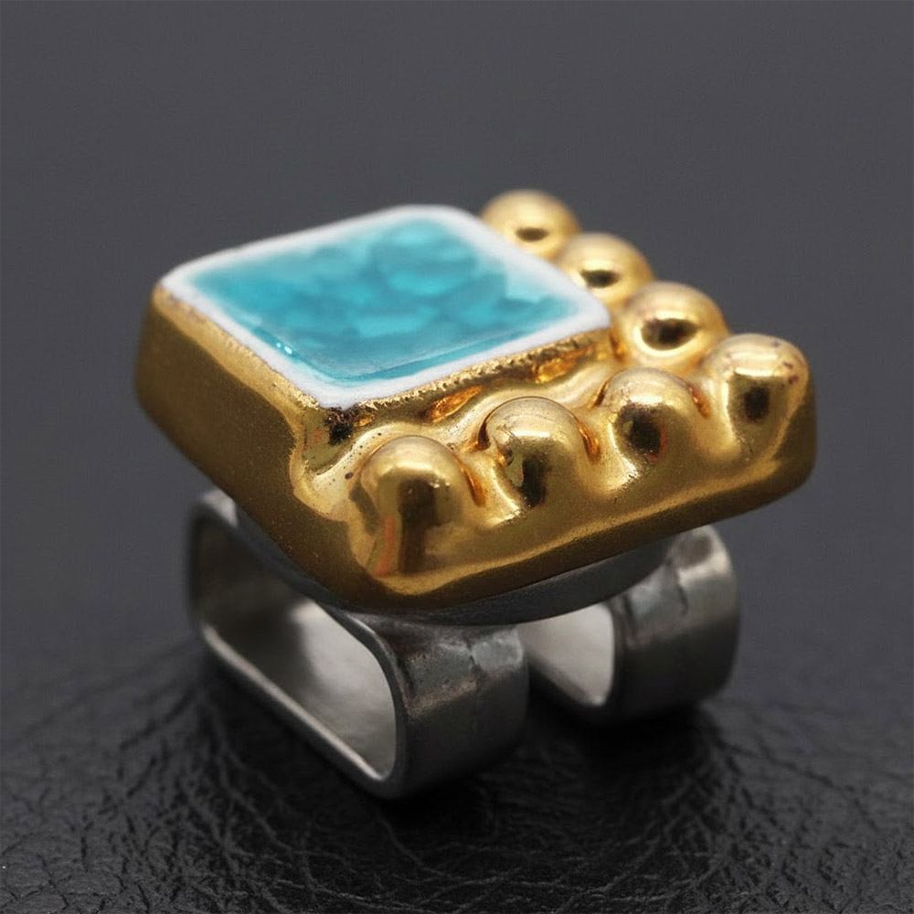 ミニマムなサイズ感とゴールドの質感がレトロ感あふれる一品です。透明感のあるターコイズは、陶片を敷き詰めた細かなディティール。異なる素材をひとつにまとめ、指先サイズに落とし込んだハイセンスなデザインになっています。