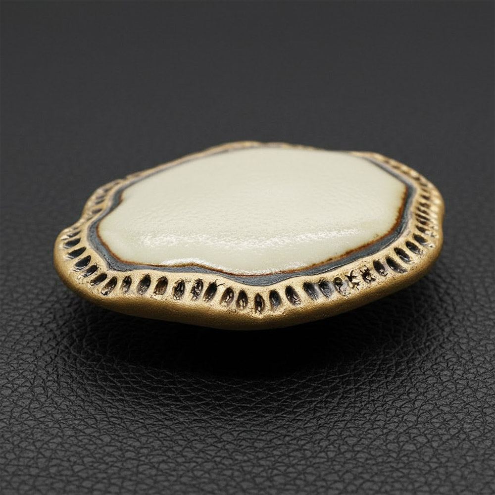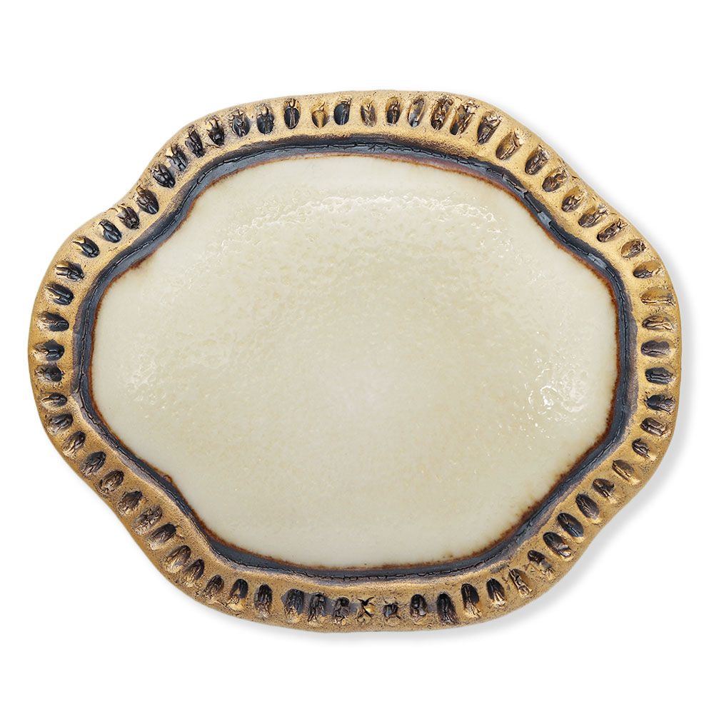 優しい生成色の素材に、金枠を飾ったレトロ感あふれる大ぶりな一品。陶器ならではの粒子感や手触りを楽しんでいただけるデザインとなっています。