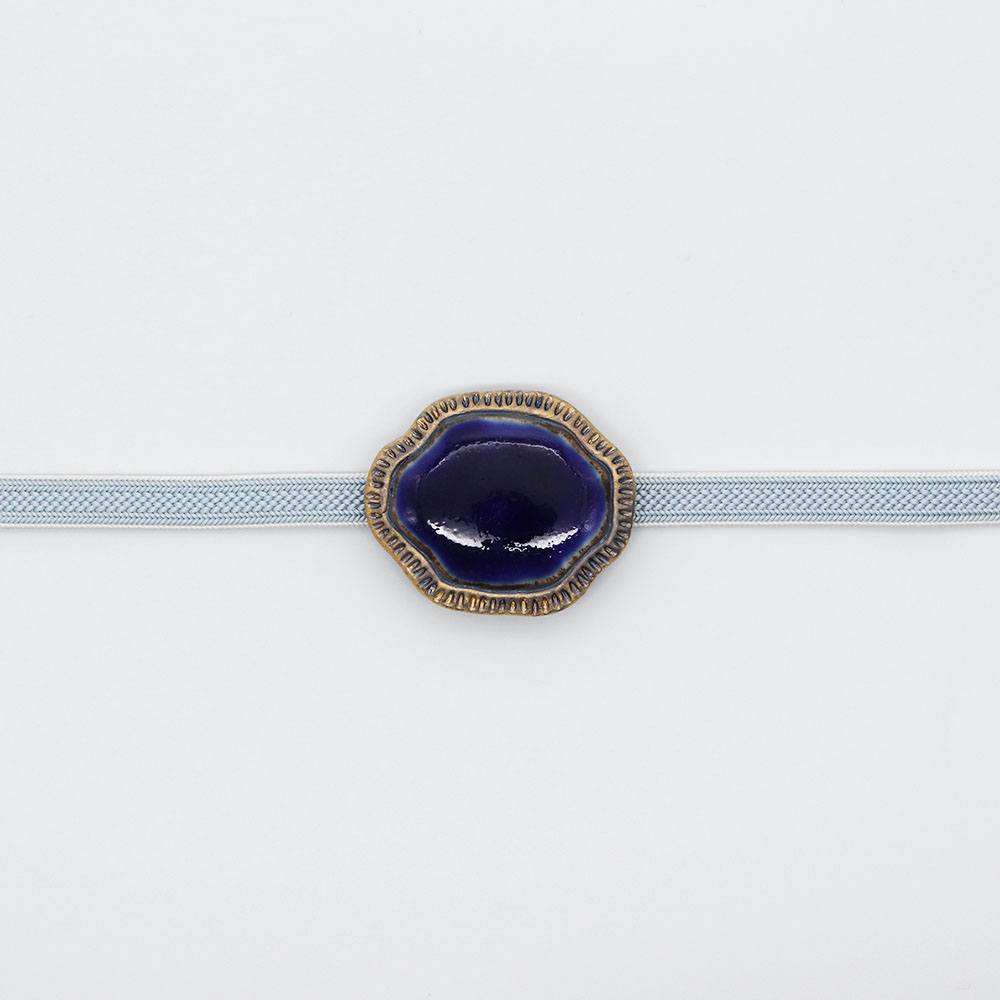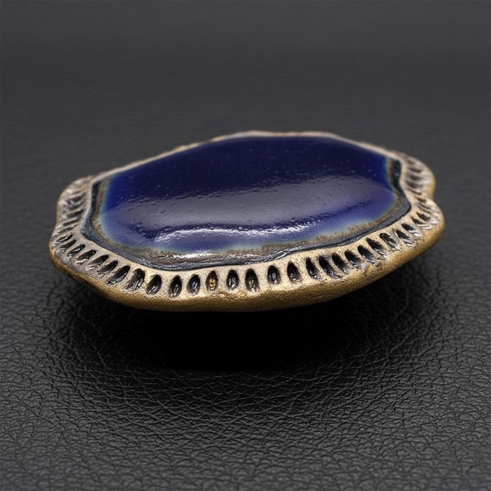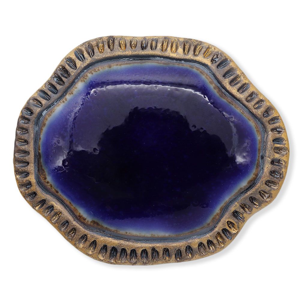 鮮やかな瑠璃色の素材に、金枠を飾ったレトロ感あふれる大ぶりな一品。陶器ならではの粒子感や手触りを楽しんでいただけるデザインとなっています。