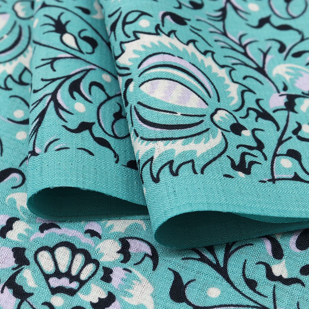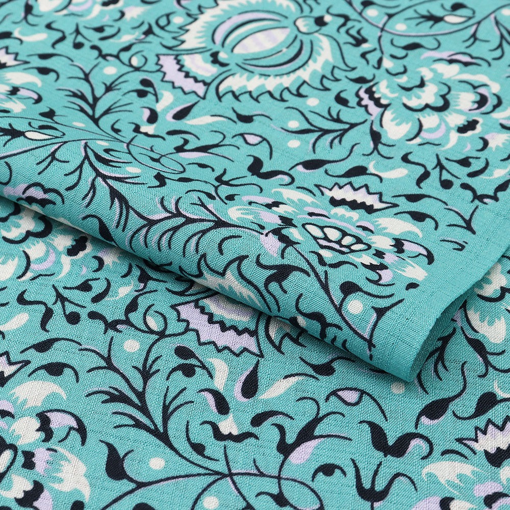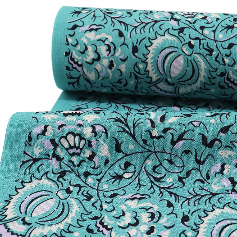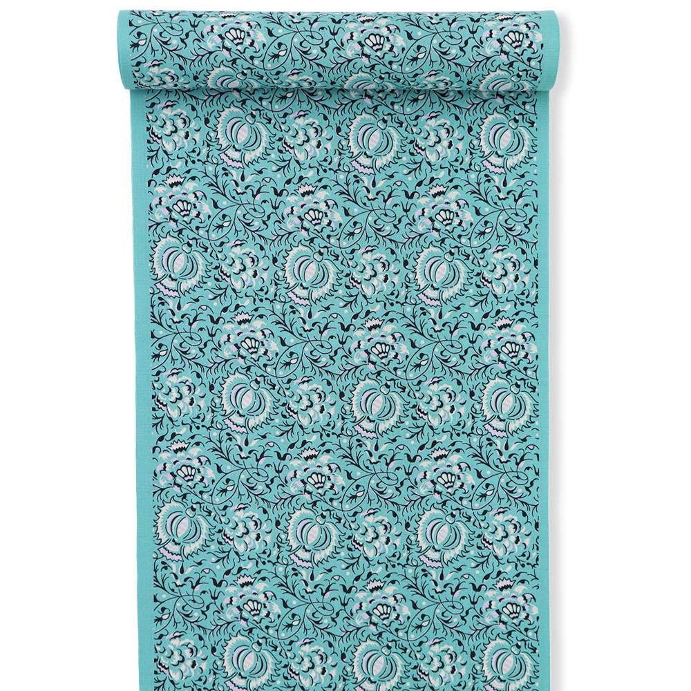 異国情緒漂う唐花模様は、青緑を基調としたカラーリングでモダンな柄行に。半幅帯を合わせればラフに、長襦袢や足袋などを合わせたコーディネートも楽しそう。
