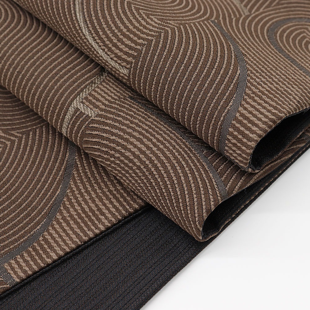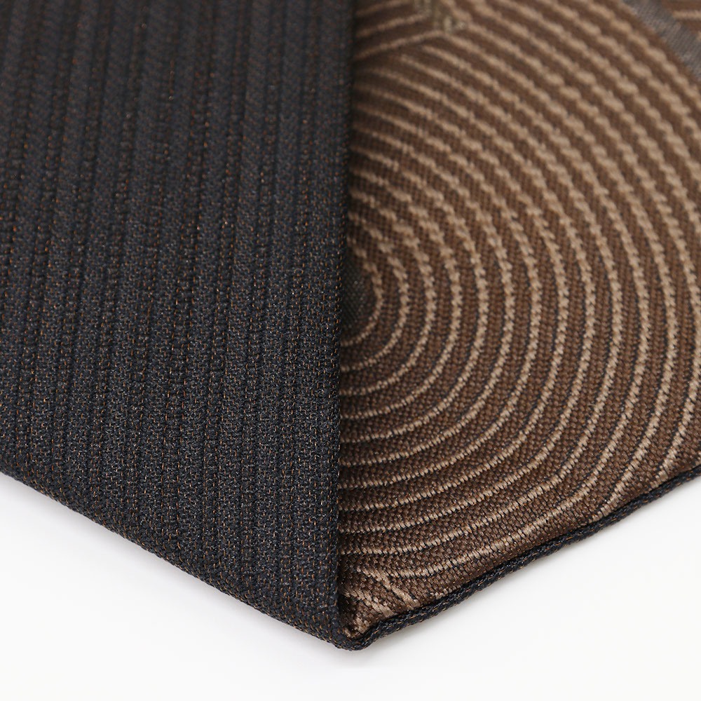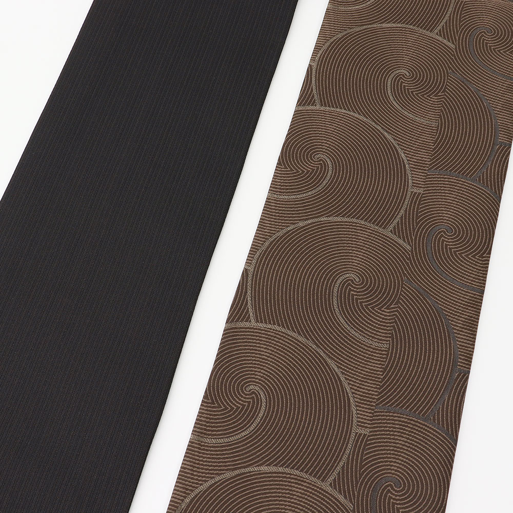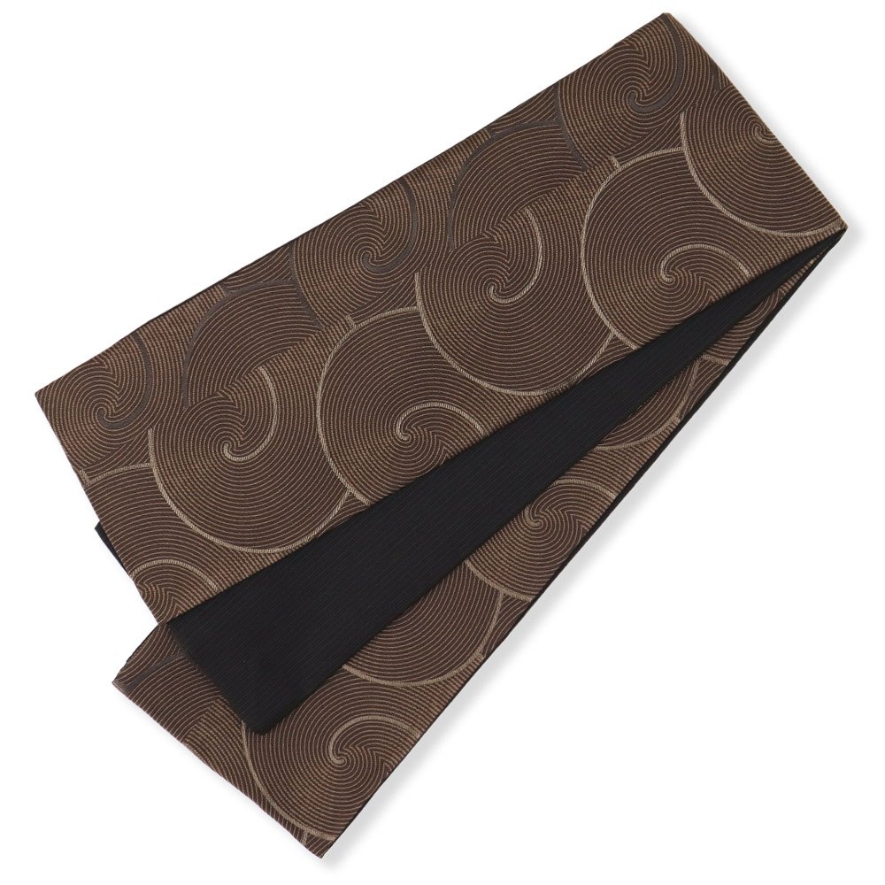 ブラウンの渦巻模様がシャープな印象の一本。織によって生み出された光沢感が暗色の色合いにマッチして、高級感を感じられる仕上がりになっています。華やかさを抑えたシンプルなデザインはモダンからカジュアルまでコーディネートしやすく、様々な着姿に幅広く活躍。お仕立て上がり品なので、加工を待たずすぐに締められるのも嬉しいですね。