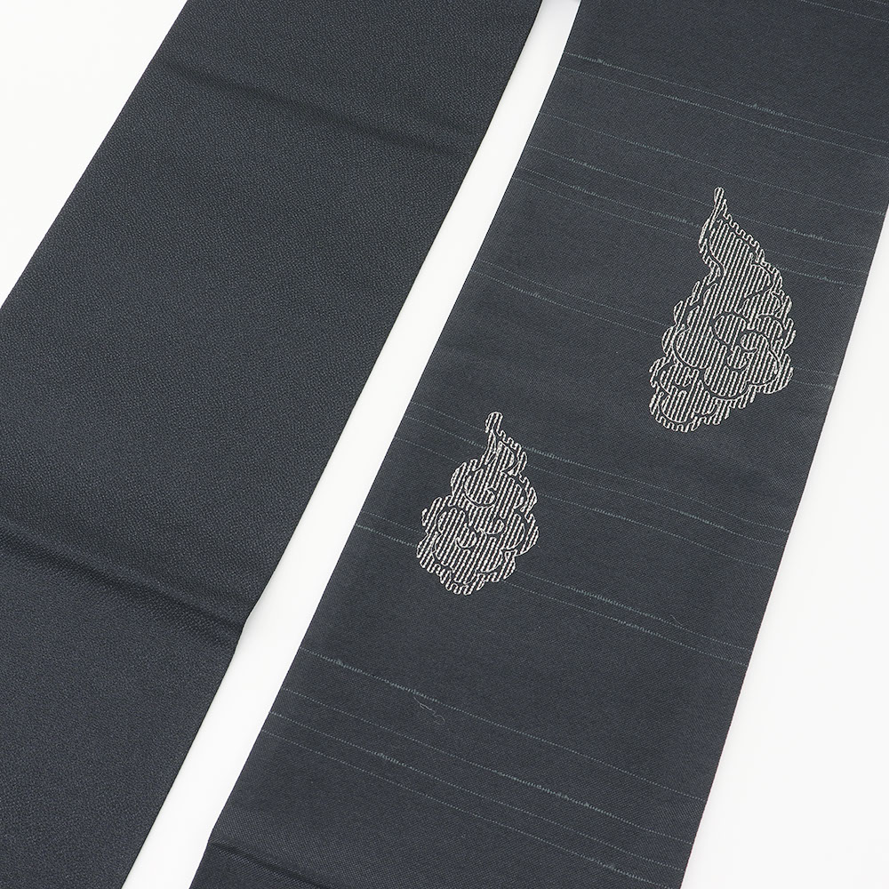 吉祥文様のひとつである瑞雲を織り出した黒色の一本。紬地のような節を持った表地が、重くなりがちな黒を軽やかな雰囲気に演出します。