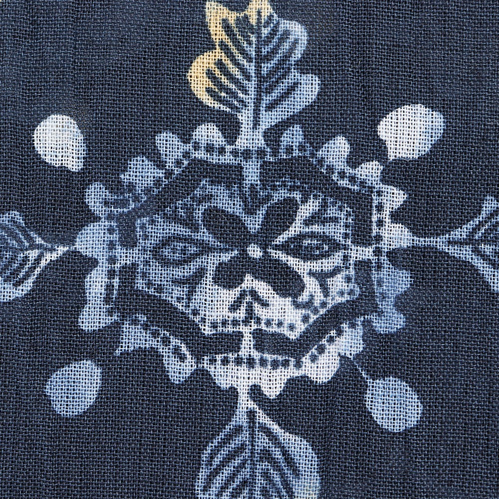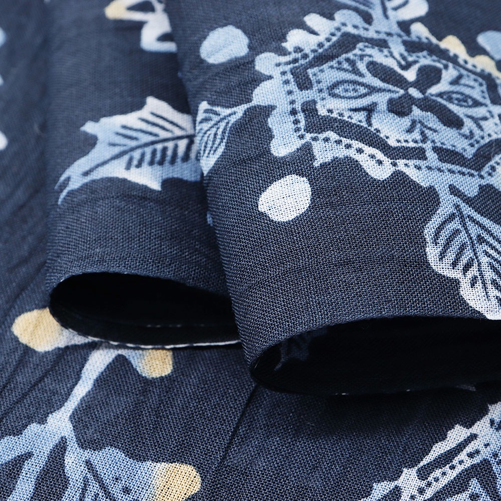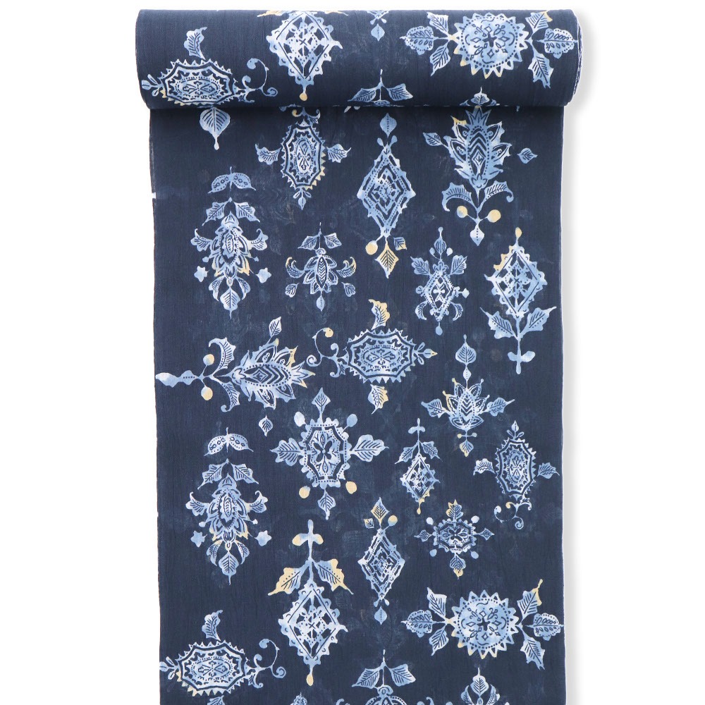 暑い季節をシックに彩る暗色カラーリングと、定番模様の更紗は水彩で描いたような柔らかなニュアンスをプラス。身に着けても目に見ても涼やかかつ上品なデザインを目指しました。