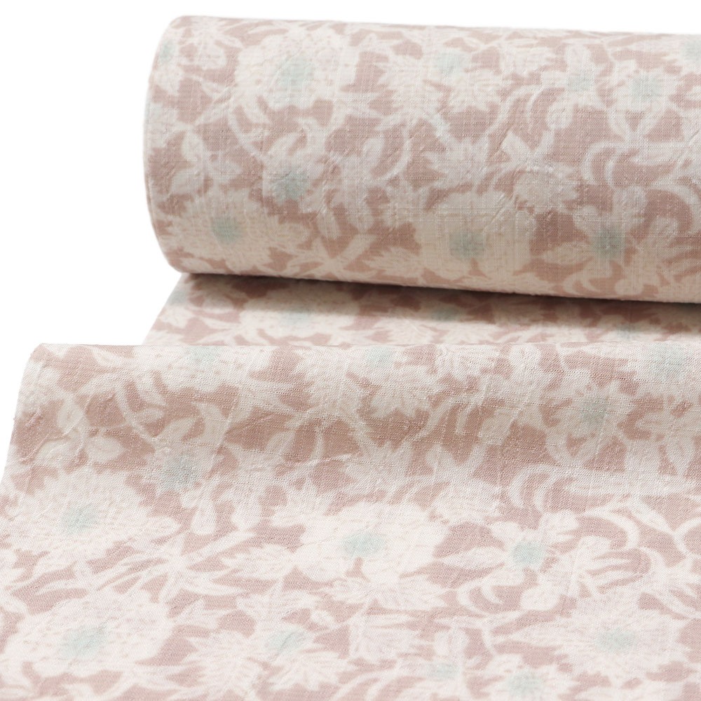 紅梅織りのような格子の織り目が味わい深い生地に、淡い唐花模様が広がるやわらかな雰囲気の一枚です。半巾帯を合わせてカジュアルに、名古屋帯を合わせればきちんと感を醸し出す夏着物に。現代の街並みに溶け込むワンピースのようなモダンさで、気軽に楽しんでいただきたい着物です。