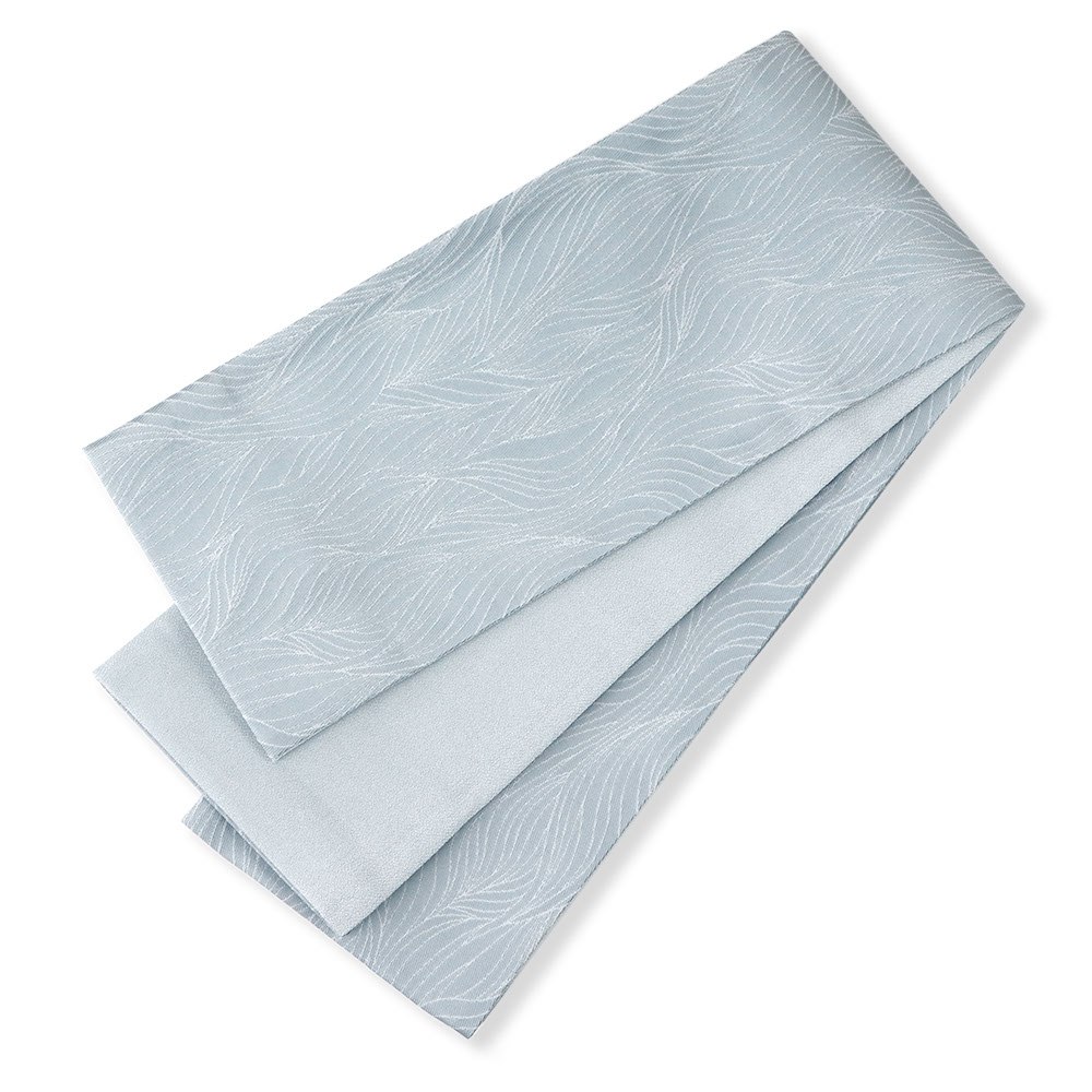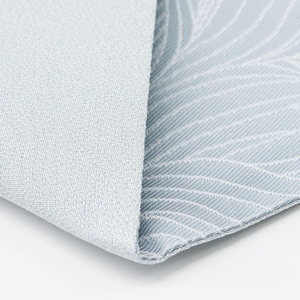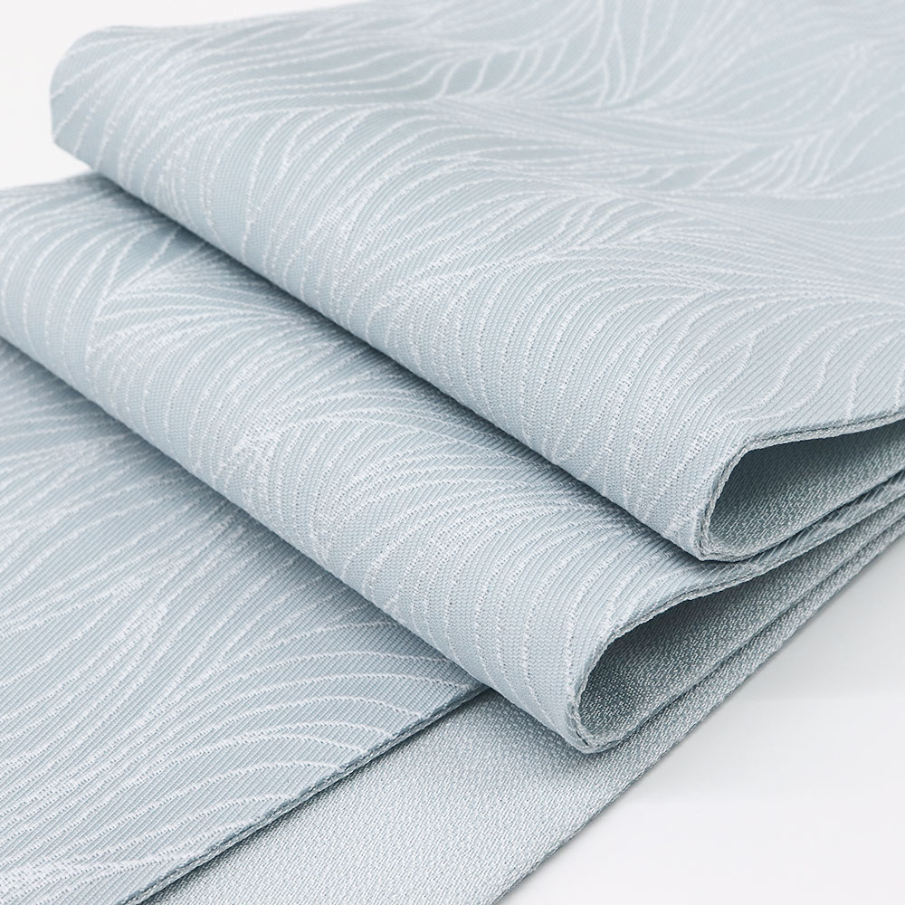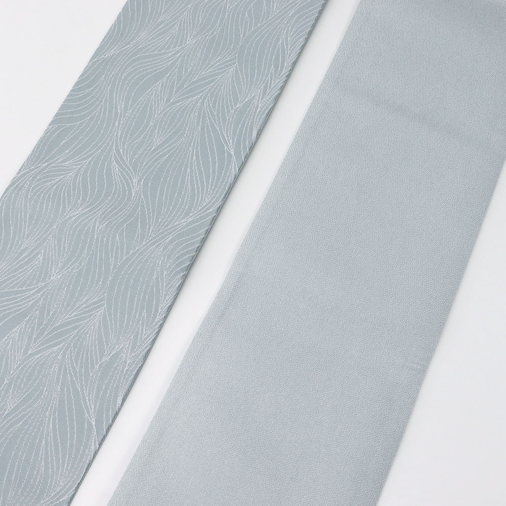 ライトブルーの色合いに、リーフ柄を織り上げた一本です。単色で織り上げることにより浮き上がる模様の陰影と光沢がモダンな雰囲気に◎裏面には同系色の無地を採用し、柄の足し引きを楽しめるデザインになっています。