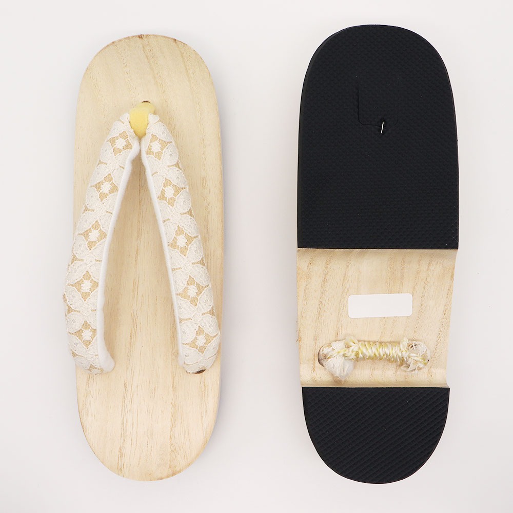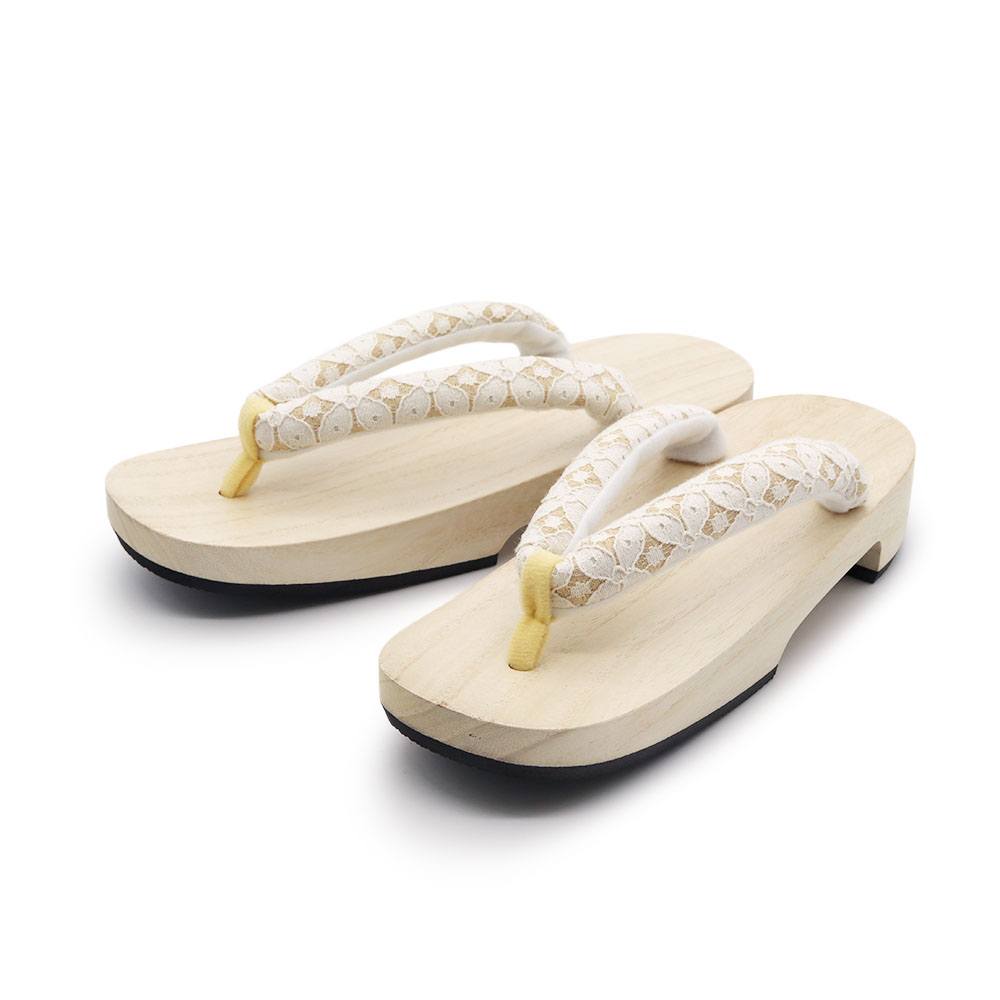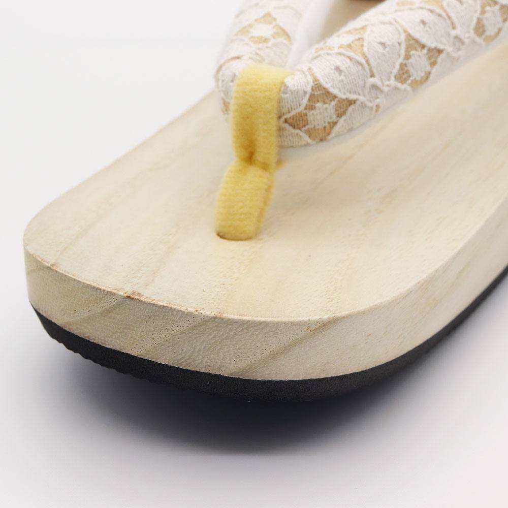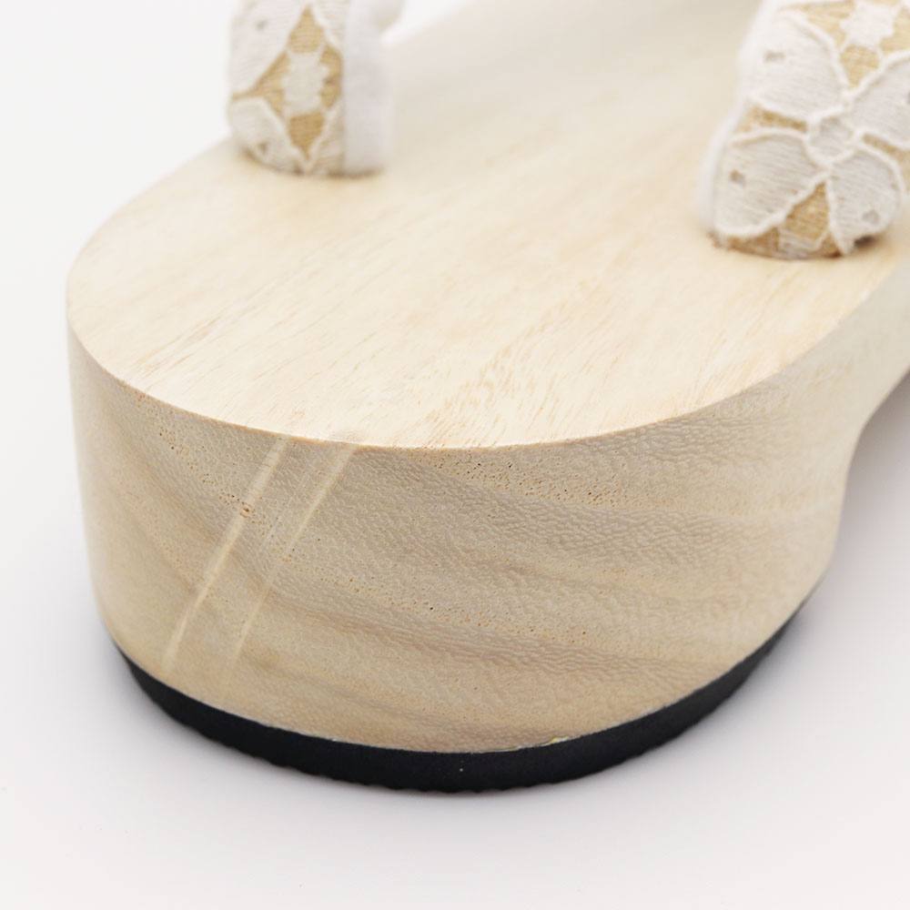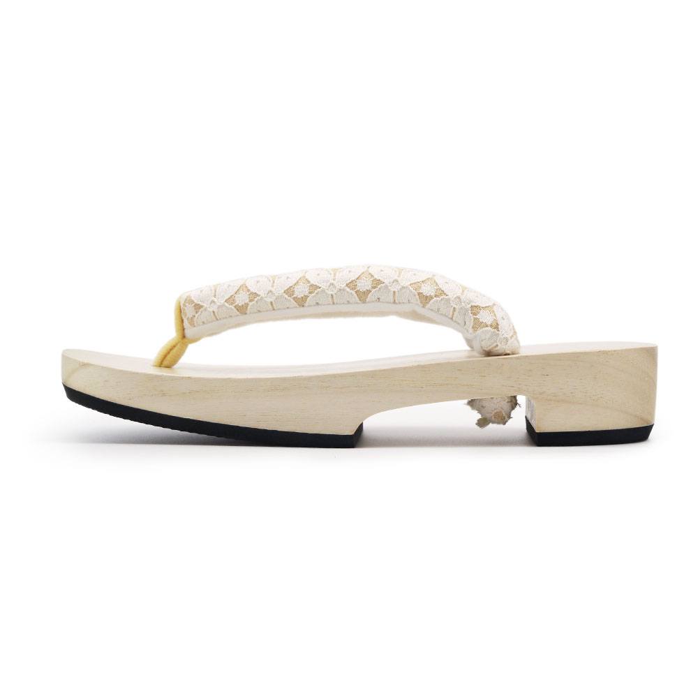 花七宝を織り出したレース鼻緒でイマドキ感を演出しながら、ふっくらとした生地感で優しい足当たりに。経年変化による台の色の移り変わりも楽しみです♪