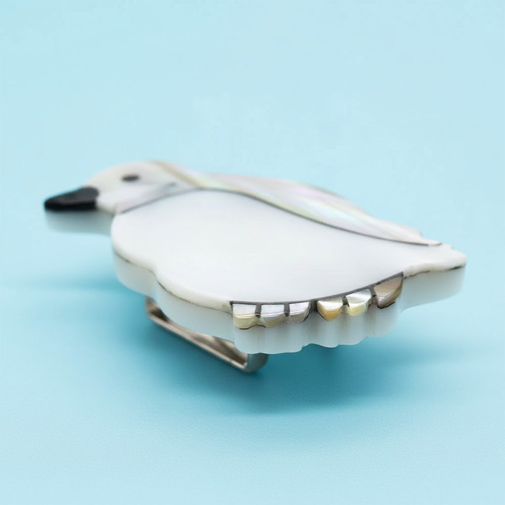 貝を使用し、温もりがあふれるアイテムを創り出す【リオン工芸】による、ペンギンを象った貝帯留。