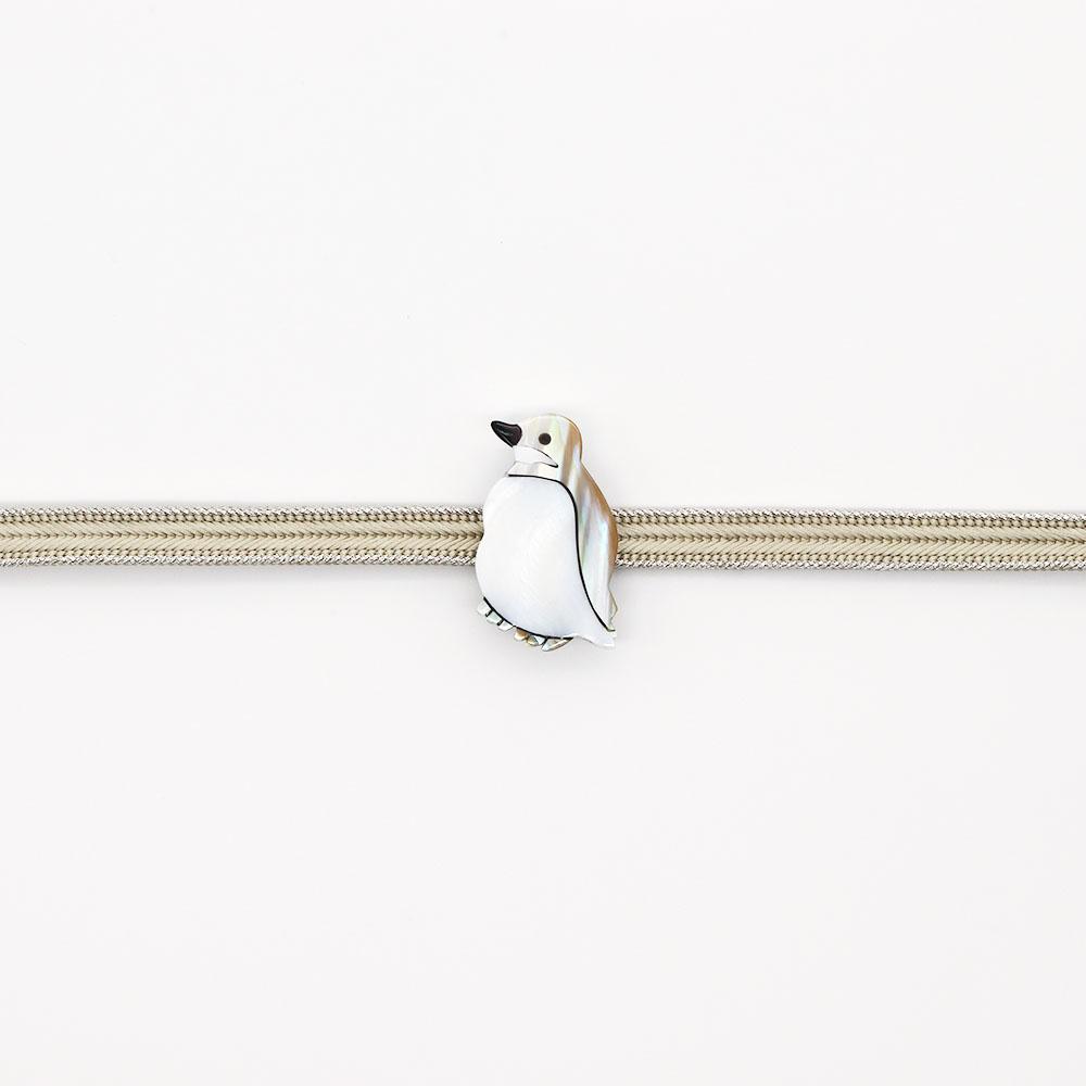 貝ならではの奥深い光沢と彩りが帯留に幾重もの表情を与え、素材本来の美しさを感じていただける逸品です。さまざまな色合いに輝く色彩は神秘的でありながら、丸みを帯びたペンギンのフォルムが可愛らしく、帯元にそっとなじむような優しい仕上がり。ちょこんと伸びた尻尾や小さな足も心惹かれる愛くるしさです。