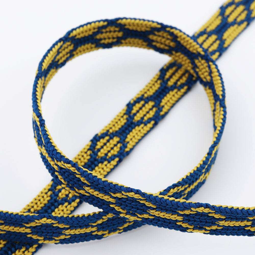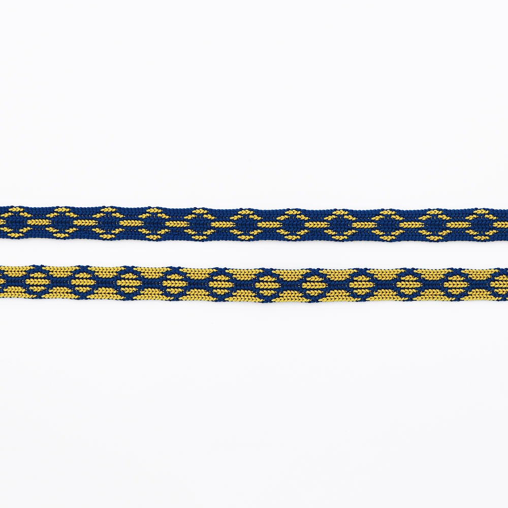 黄と青で表現された亀甲模様が特徴的な綾竹組みの一本です。薄手な組み上がりなので、帯元にピッタリと添い、結び目などのボリュームも抑えられるスマートさ。リバーシブルな昼夜組みになっているので、その日の気分によってコーディネートできるのも嬉しいですね◎