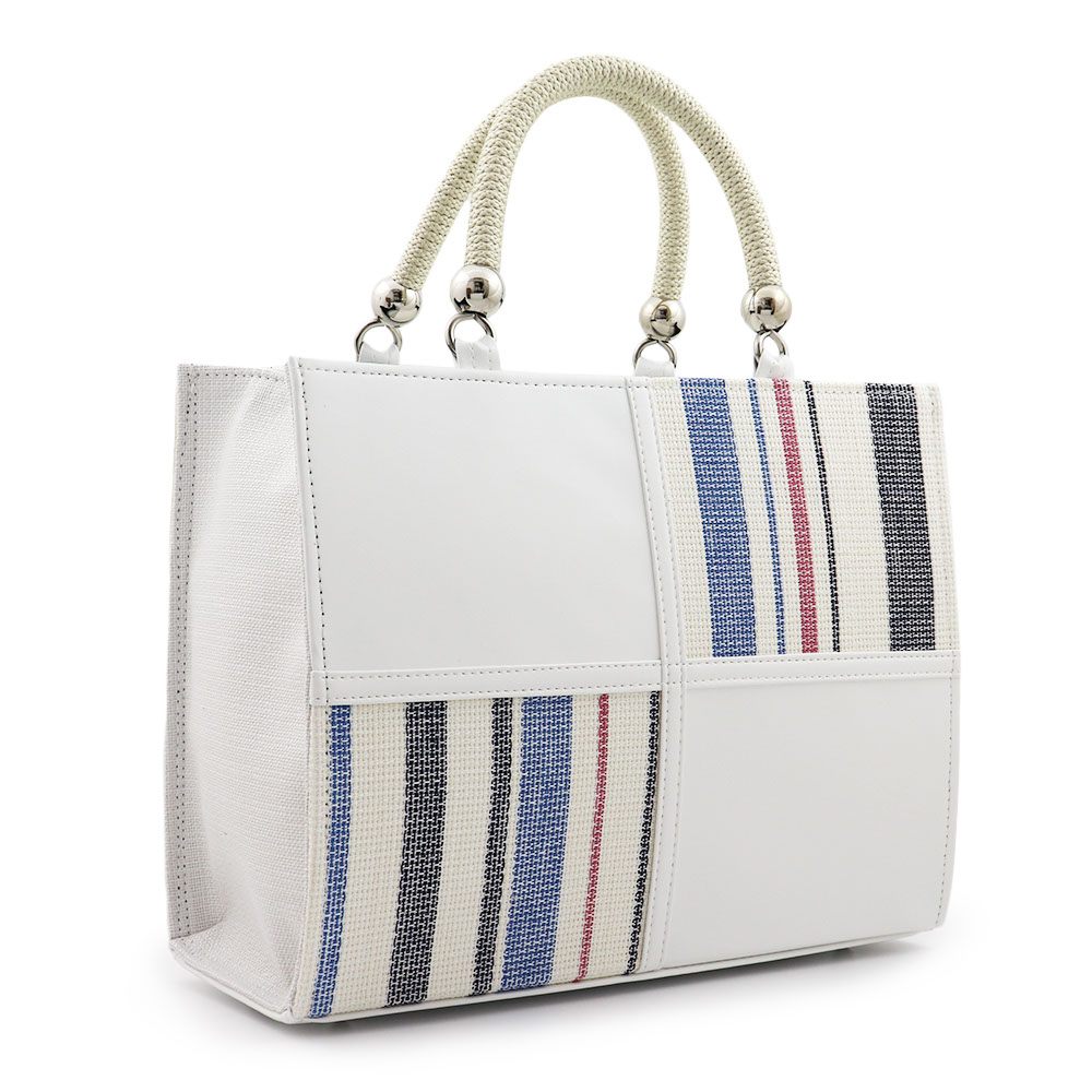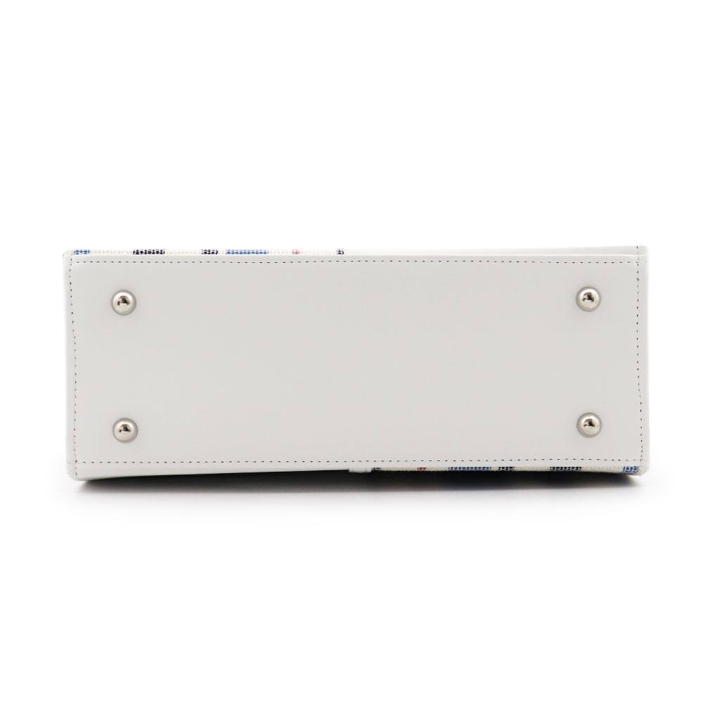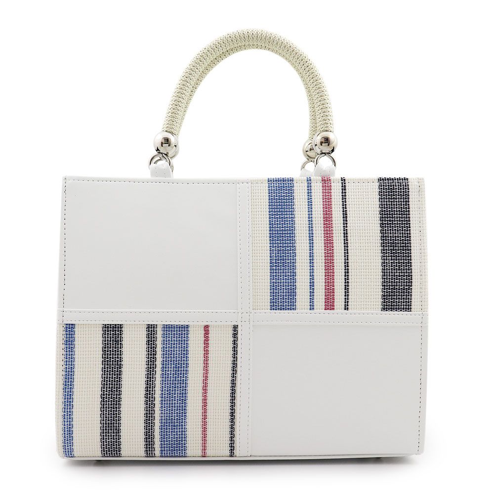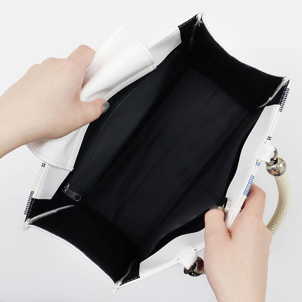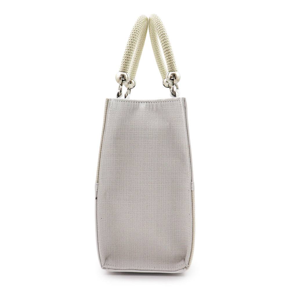 麻地のざっくりとしたナチュラルな風合いと、レザーのなめらかな質感がマッチした一品。白×青を基調としたマリンカラーに、銀パーツとロープのような持ち手もあいまって爽やかな仕上がりです。