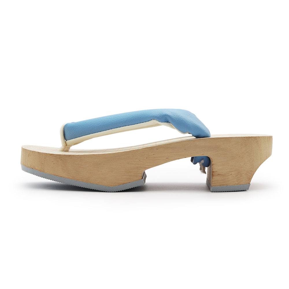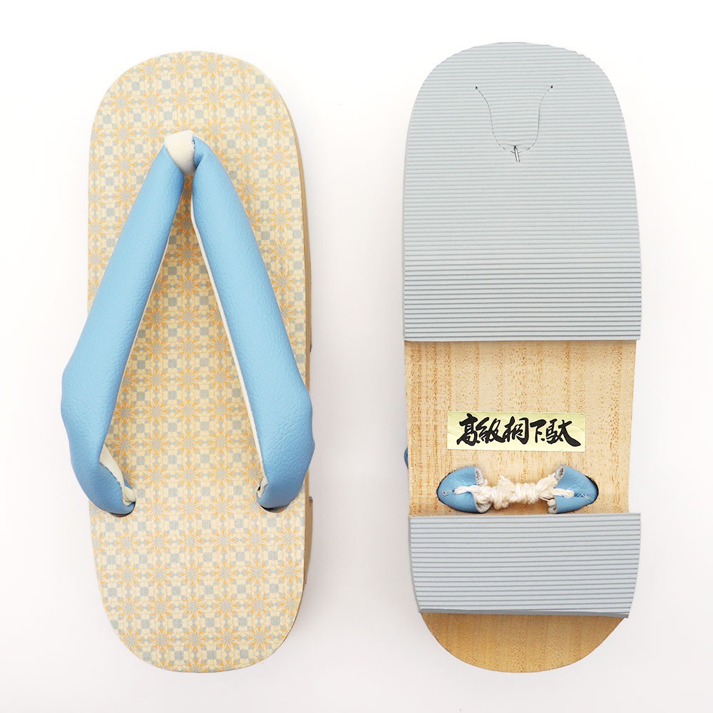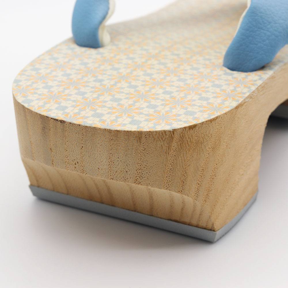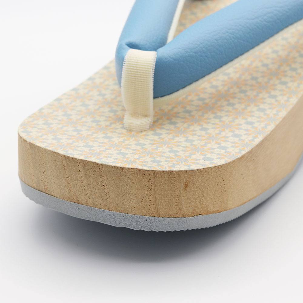 万華鏡や硝子切子を思わせる涼し気なデザインが夏の装いにピッタリ。それいでいてレザー調の鼻緒が、しっかりとした重厚感も与えてくれるので、足袋を履いた時や少しキレイめに仕上げたい時にも違和感なく履いていただけます。