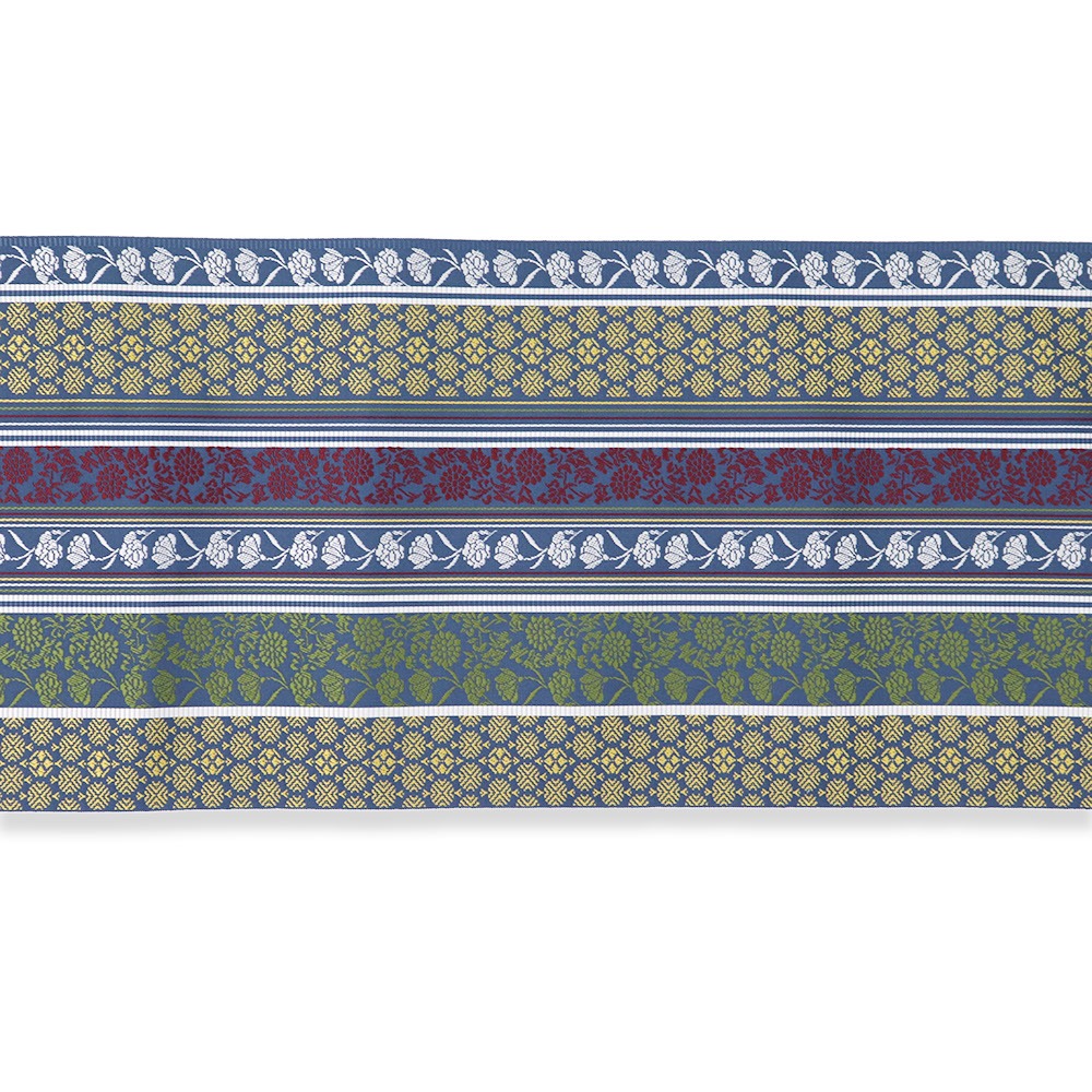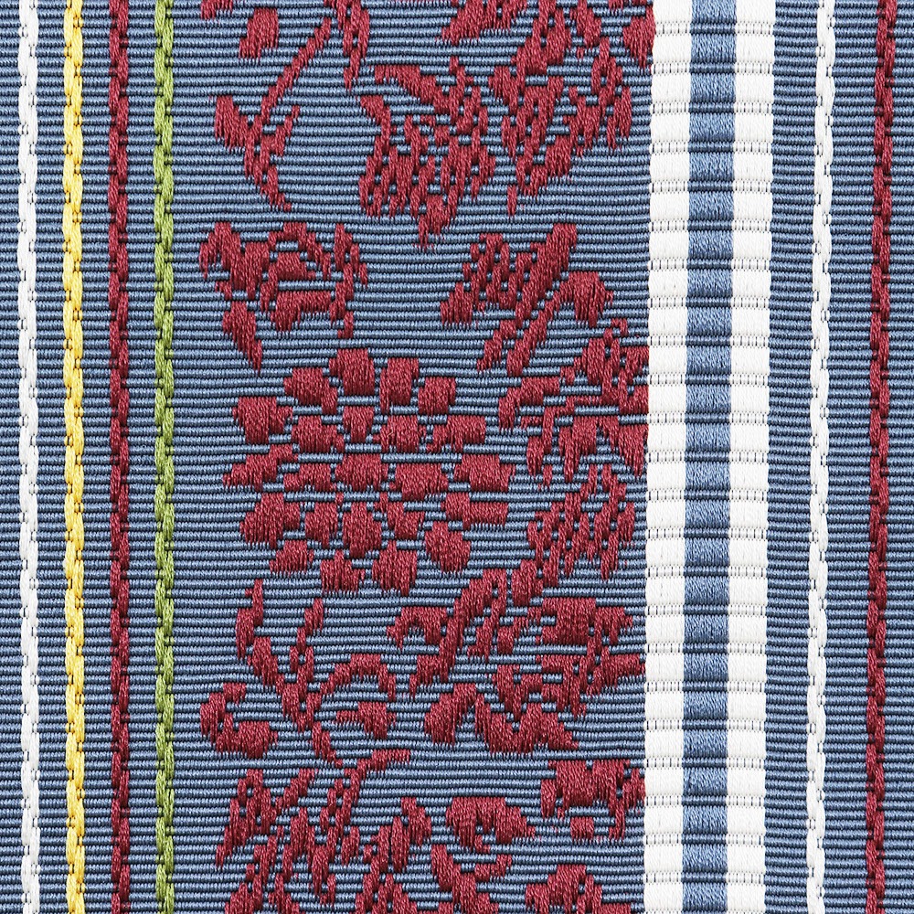 経糸を多く使い、緯糸を強く打ち込むことで密度が高く軽やかで締めやすい博多織の良いところはそのままに、定番の献上柄とは違うモダンな柄行きを楽しむことができる一本。青灰色やカラシ色など、深い色使いで織り上げられた更紗間道が格調高い仕上がりで、品のある引き締まった着姿を演出します。