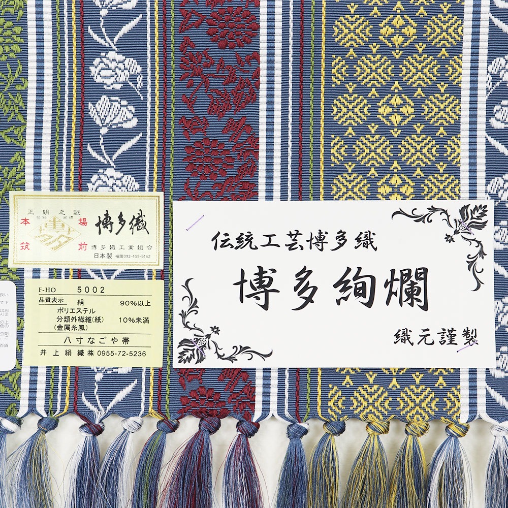 博多織工業組合「金証紙」の貼られた【井上絹織】による八寸名古屋帯『博多絢爛』シリーズ。