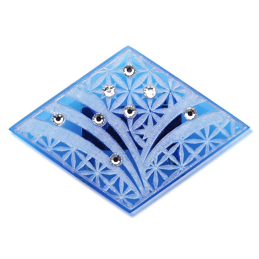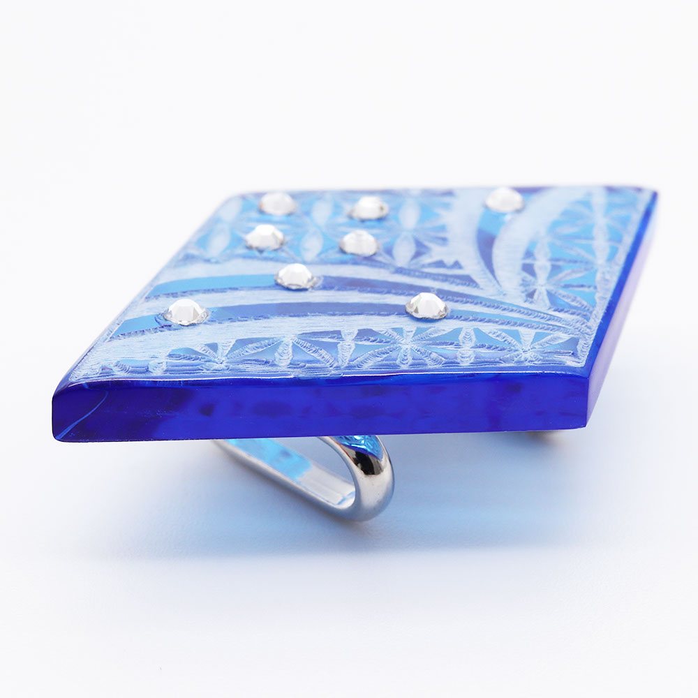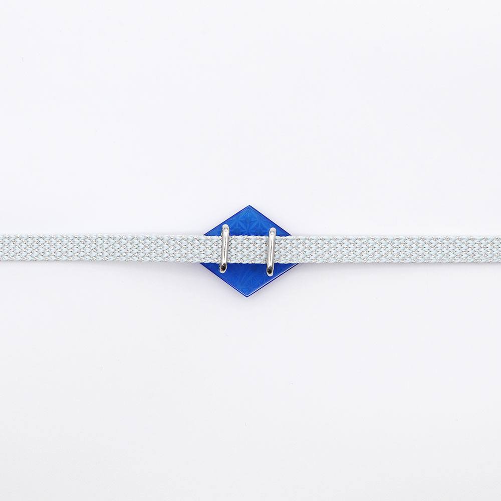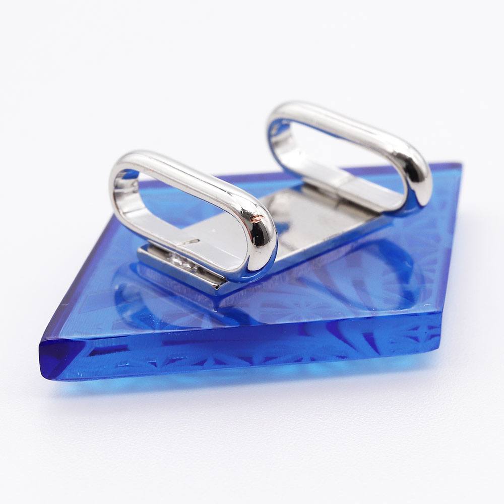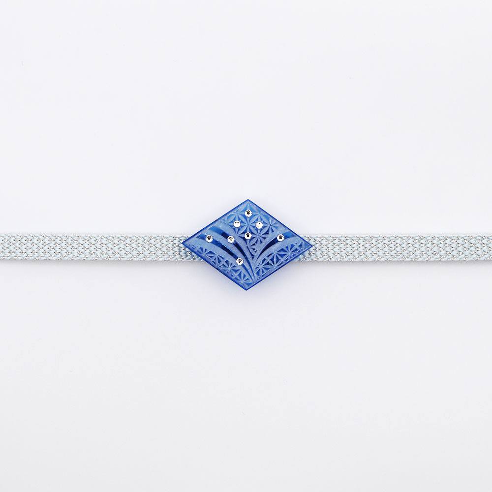 鮮やかなブルーの菱型台に、切子風の透かし柄が描かれてた涼しげな逸品。ラインストーンが繊細なきらめきを放ち、夏日に映える華やかな仕上がりに。三分紐の柄も透けて見え隠れするので、コーディネートが楽しくなりそうな帯留です。