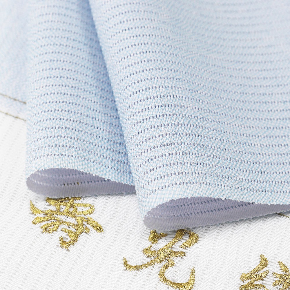 また、染め模様が美しく出るのも絽生地ならではの良さ。水色の面には鮫模様のような細かな柄行き、青藤色の面は無地で染められており、単衣で仕立てて裏地の粋をお楽しみいただける両面染めになっています。