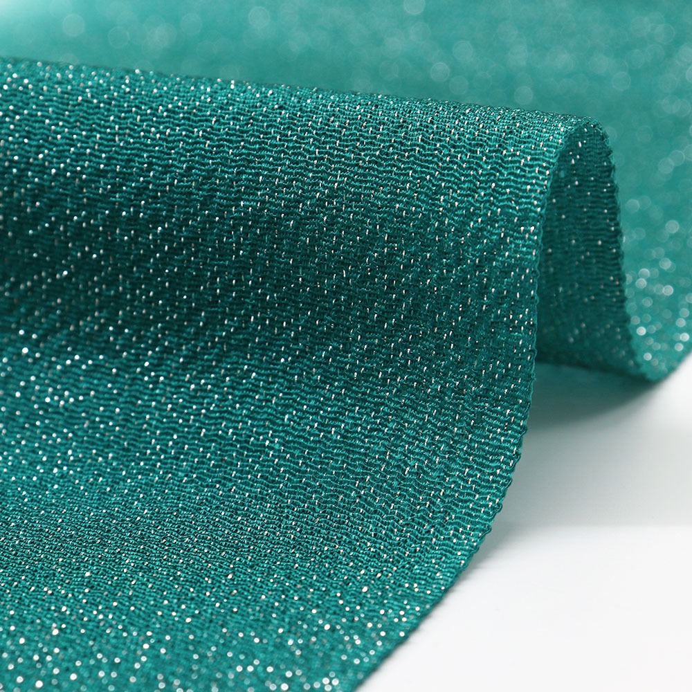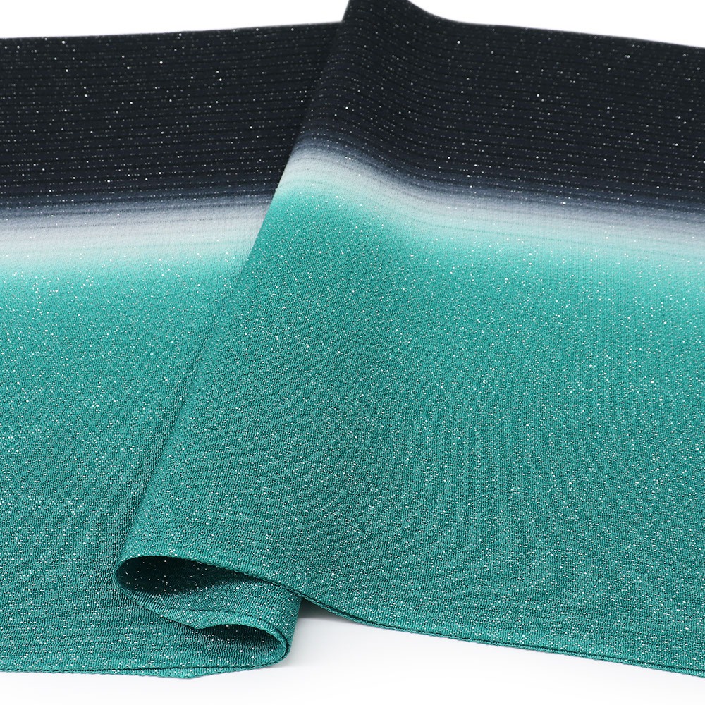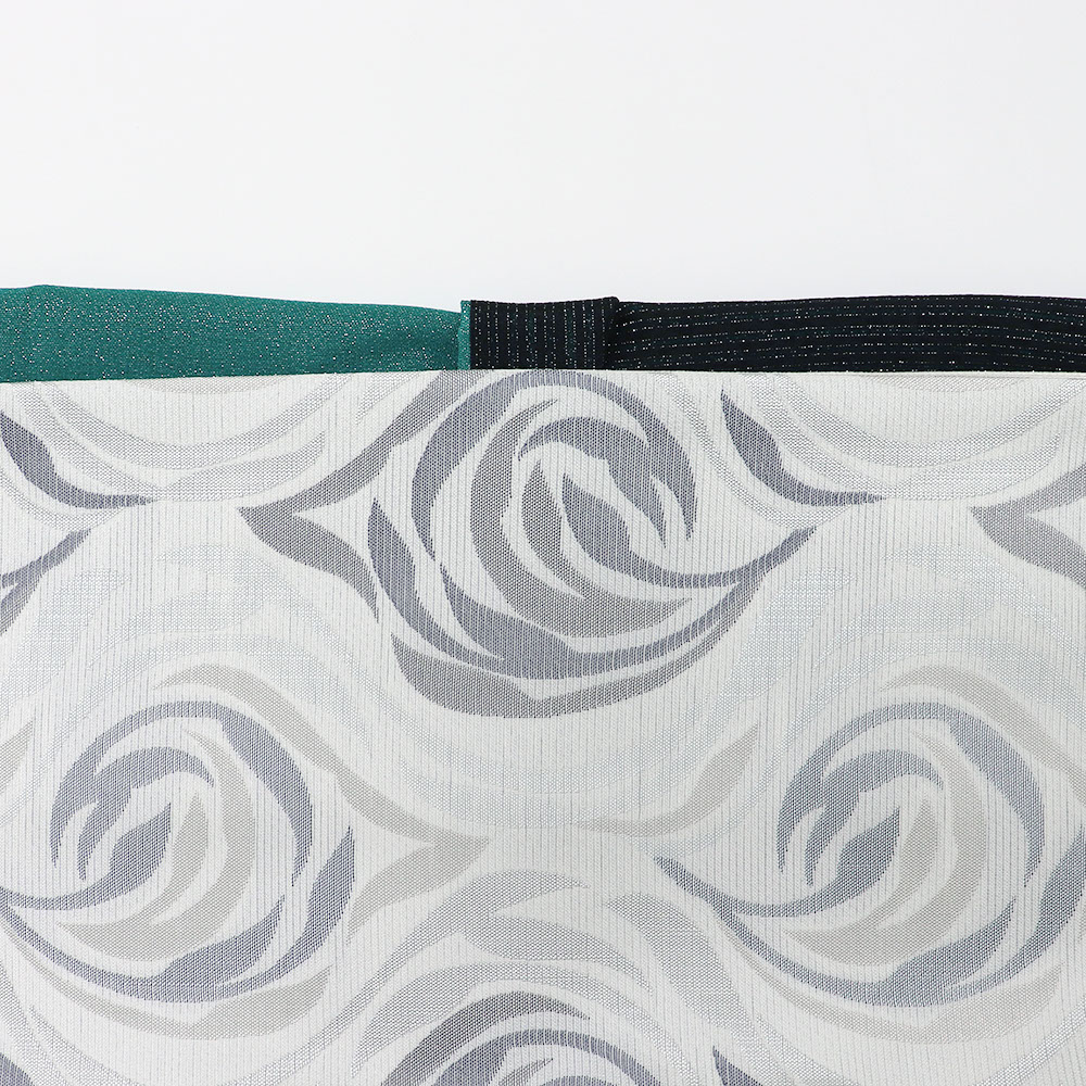 片側は細かいシボがふっくらとした質感を生み出す縮緬地、もう片側はほどよい透け感が涼しげな印象を与えてくれる縦絽生地。縦にそれぞれ異なる織を配し、季節やコーディネートによって幅広く使える一枚になっています。箔糸はどちらにも織り込まれ、華やかさはそのままに。黒×青緑のモダンなバイカラーが、カジュアルコーデのアクセントに活躍してくれそうです。