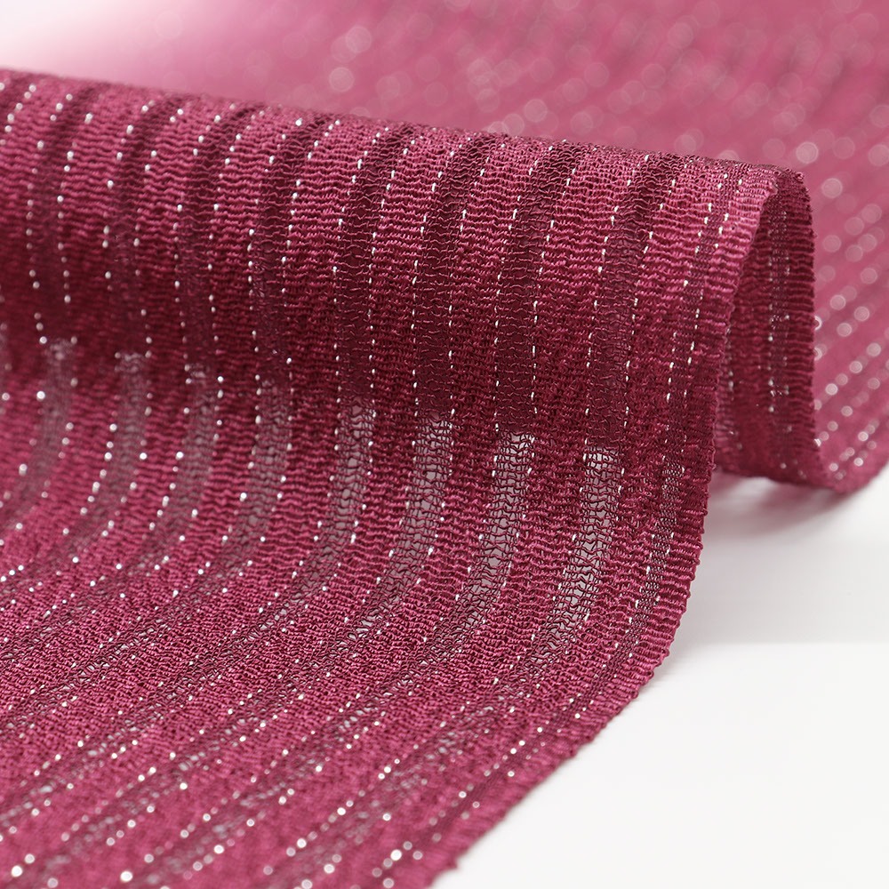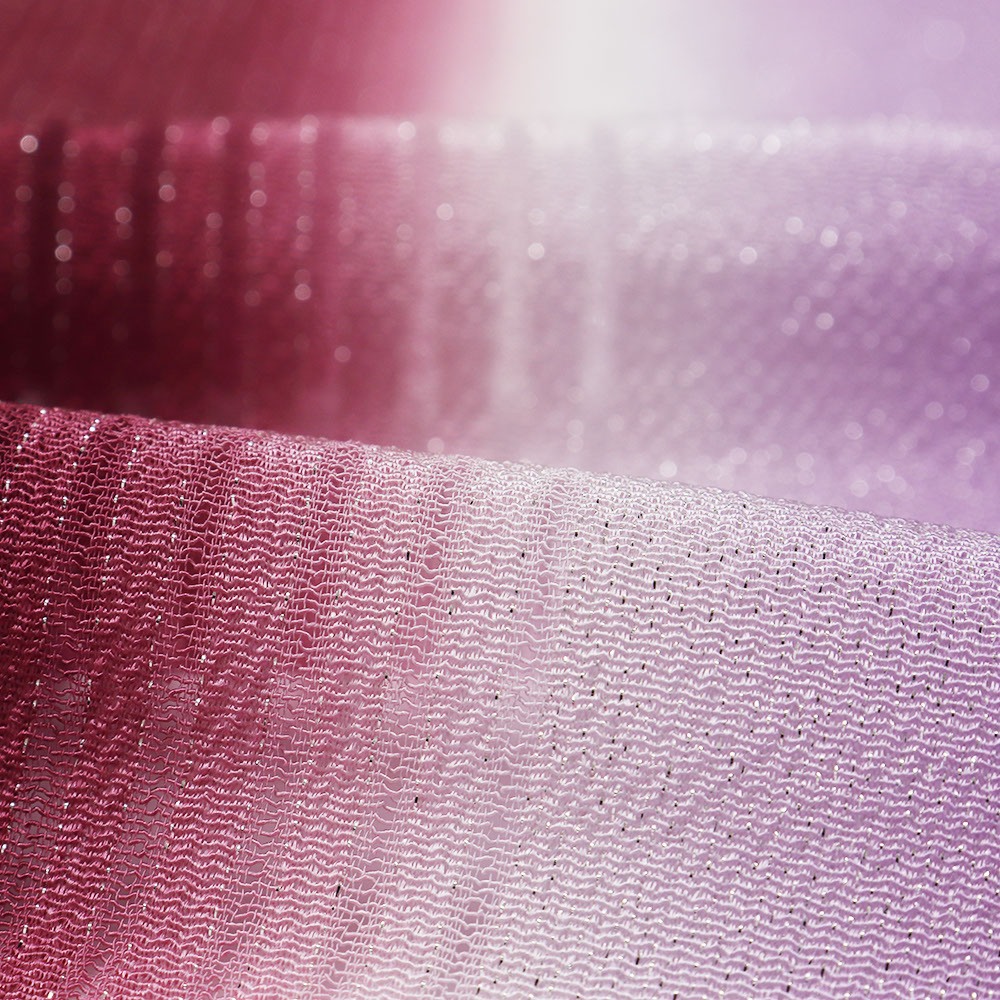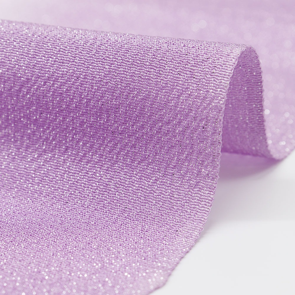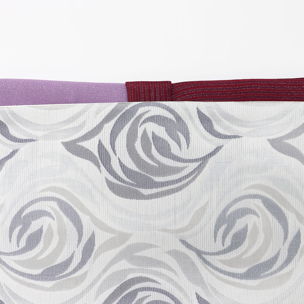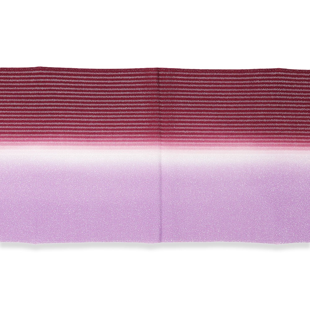 片側は細かいシボがふっくらとした質感を生み出す縮緬地、もう片側はほどよい透け感が涼しげな印象を与えてくれる縦絽生地。縦にそれぞれ異なる織を配し、季節やコーディネートによって幅広く使える一枚になっています。箔糸はどちらにも織り込まれ、華やかさはそのままに。赤紫×藤の上品なバイカラーが、カジュアルコーデのアクセントに活躍してくれそうです。