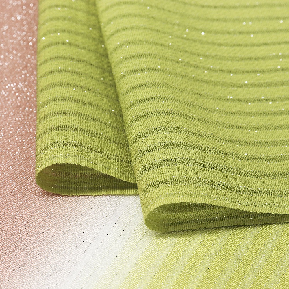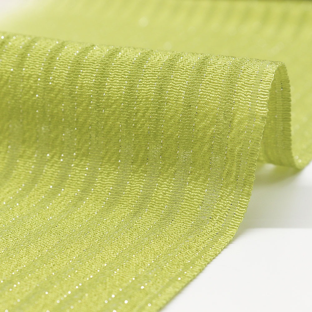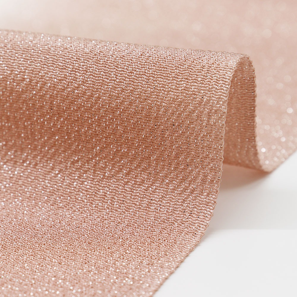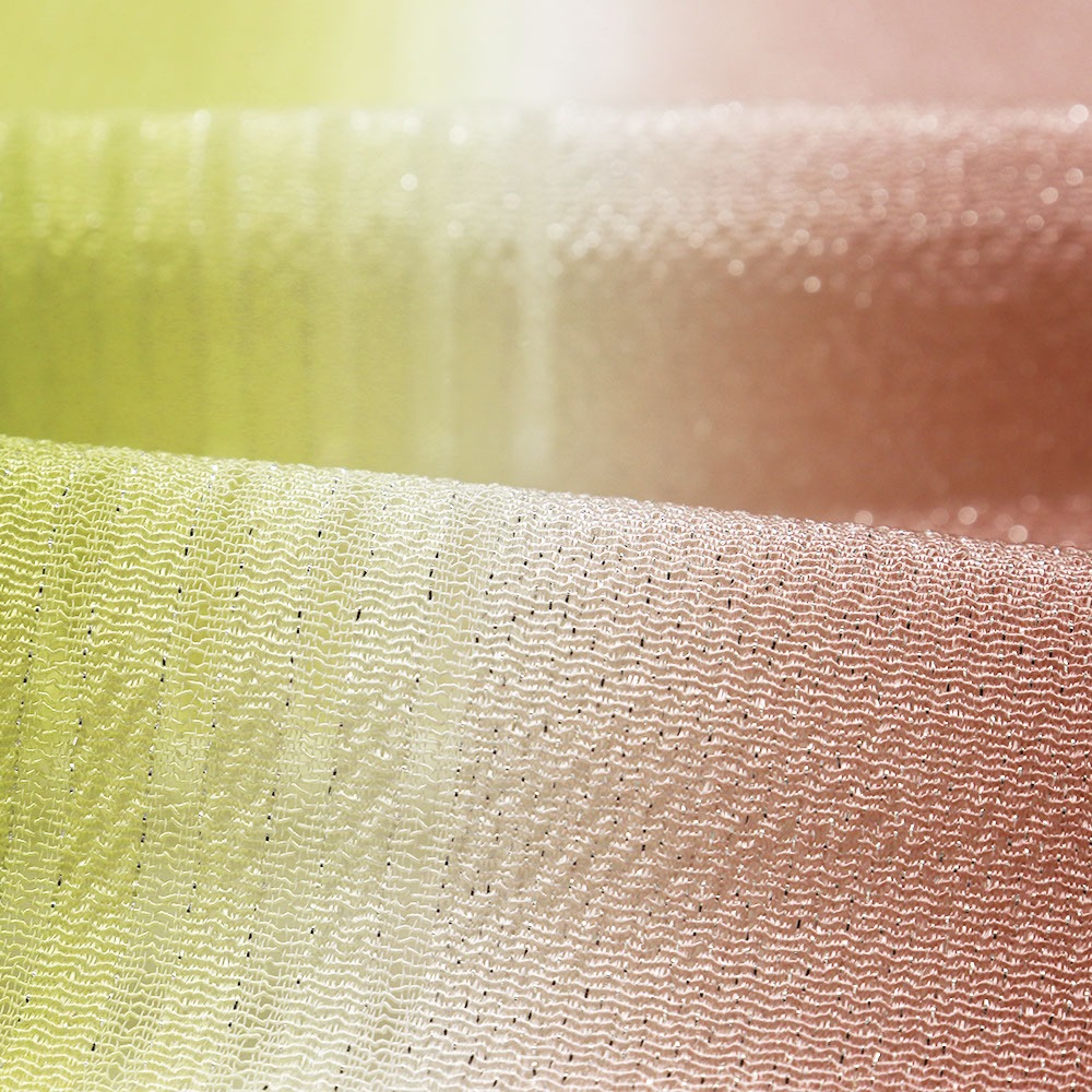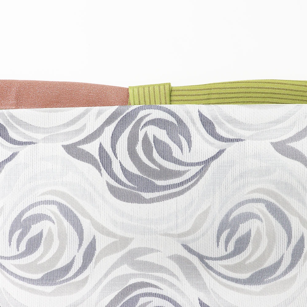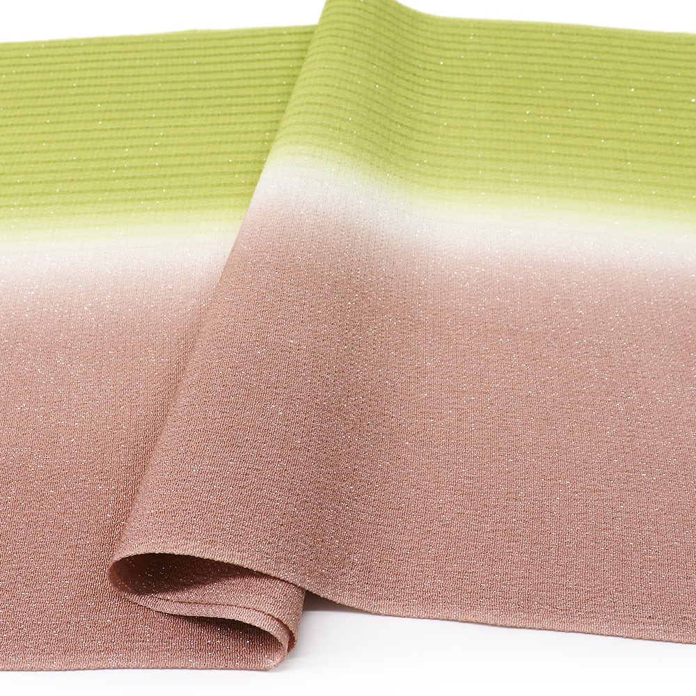 片側は細かいシボがふっくらとした質感を生み出す縮緬地、もう片側はほどよい透け感が涼しげな印象を与えてくれる縦絽生地。縦にそれぞれ異なる織を配し、季節やコーディネートによって幅広く使える一枚になっています。箔糸はどちらにも織り込まれ、華やかさはそのままに。抹茶×桃の上品なバイカラーが、カジュアルコーデのアクセントに活躍してくれそうです。