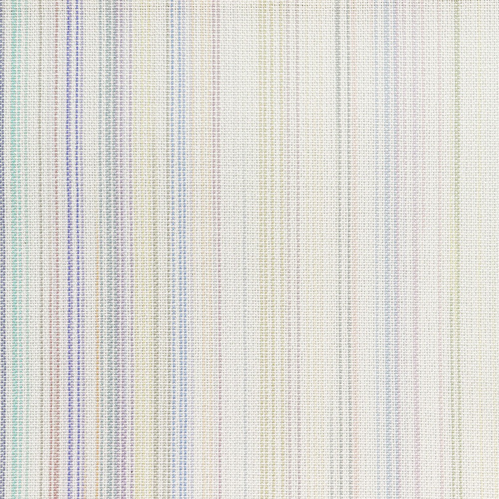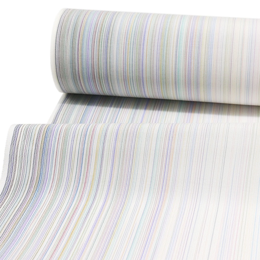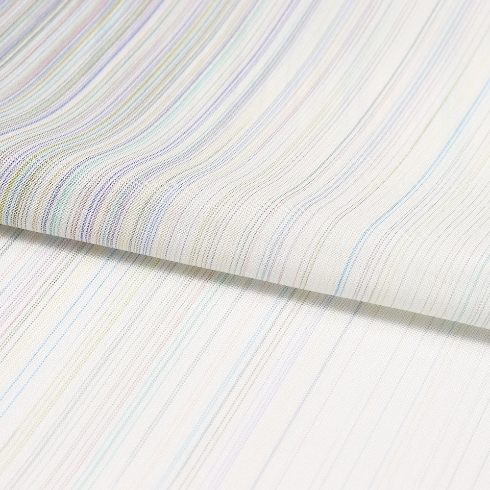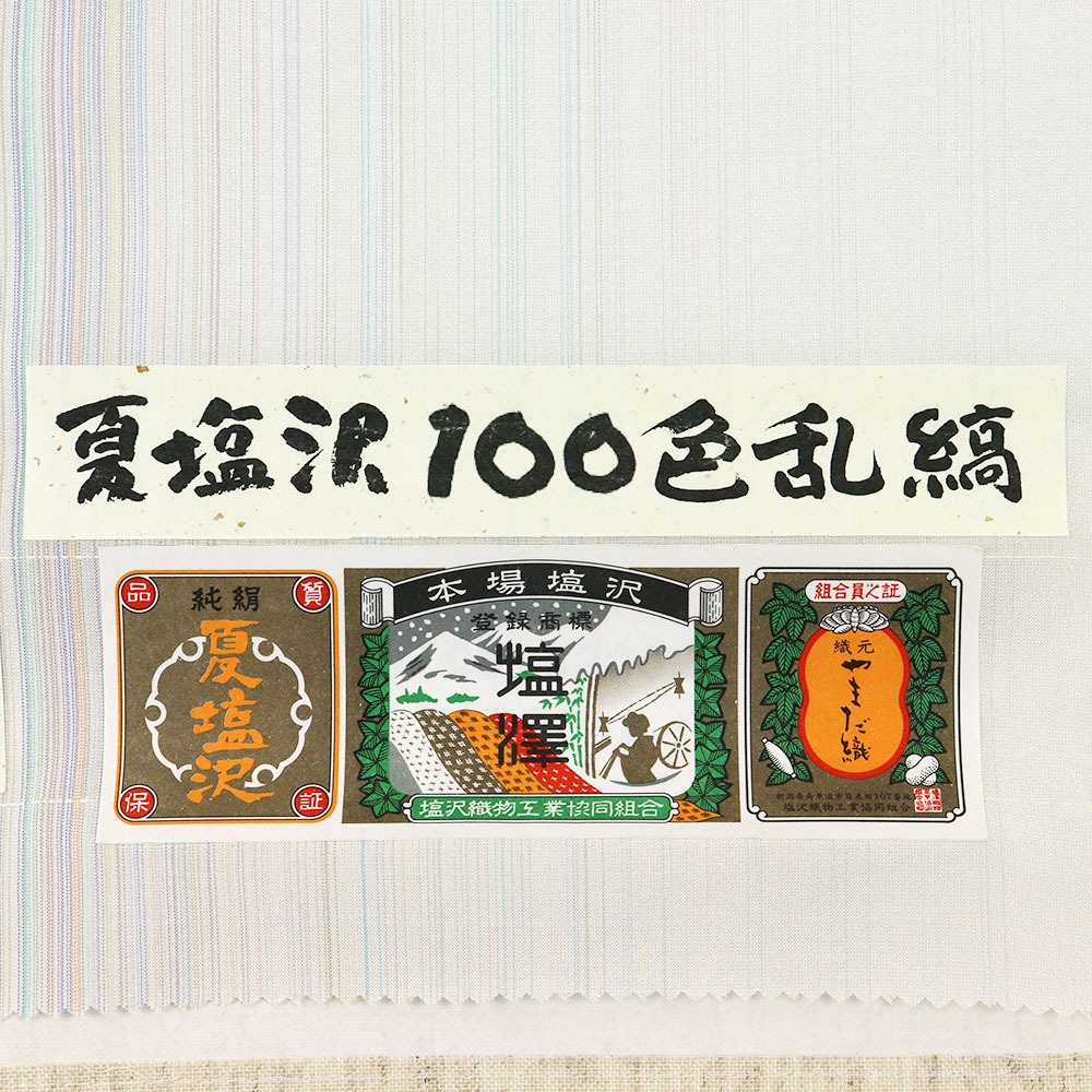 『100色乱縞』の名の通り、様々な色の糸を用いて片身に乱縞を表現。透き通るような白色の地に彩りを加えた雅なデザインに、夏塩沢の風合いで、夏の着姿を粋に、風流に演出します。