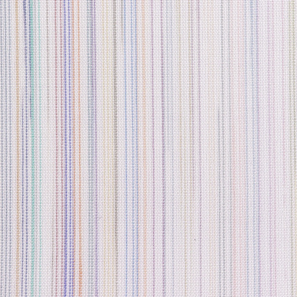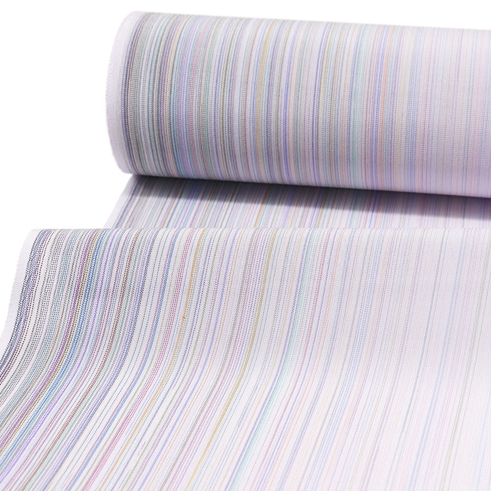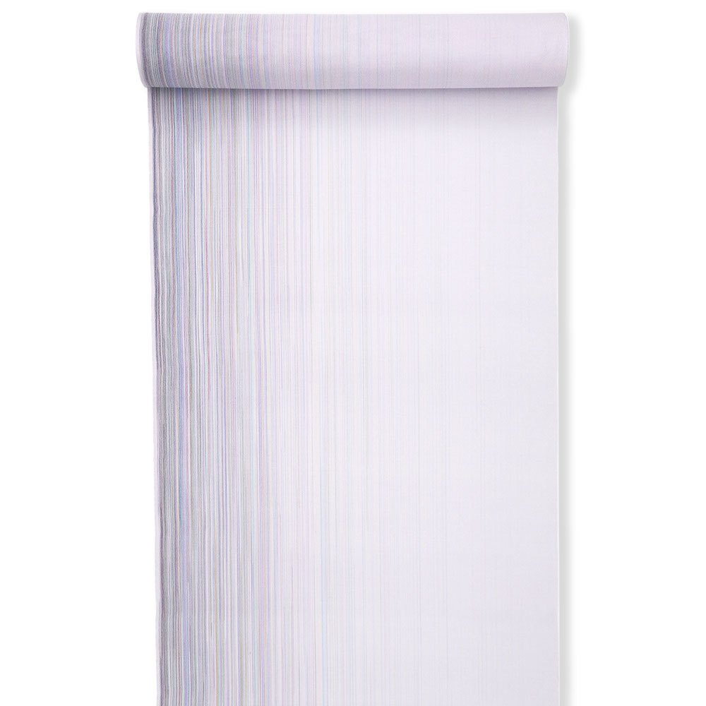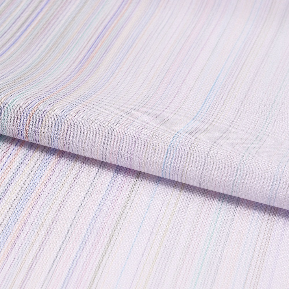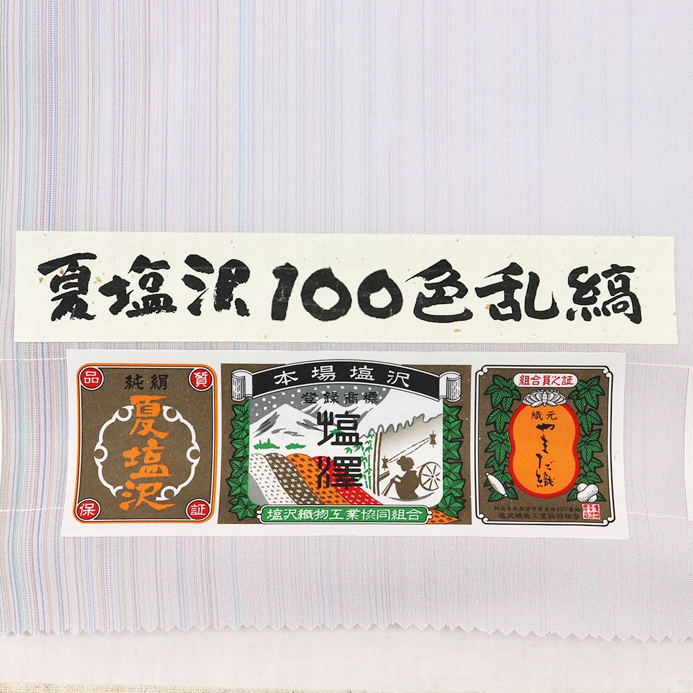 『100色乱縞』の名の通り、様々な色の糸を用いて片身に乱縞を表現。透き通るような藤色の地に彩りを加えた雅なデザインに、夏塩沢の風合いで、夏の着姿を粋に、風流に演出します。