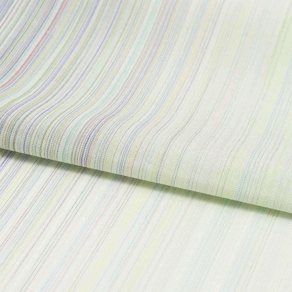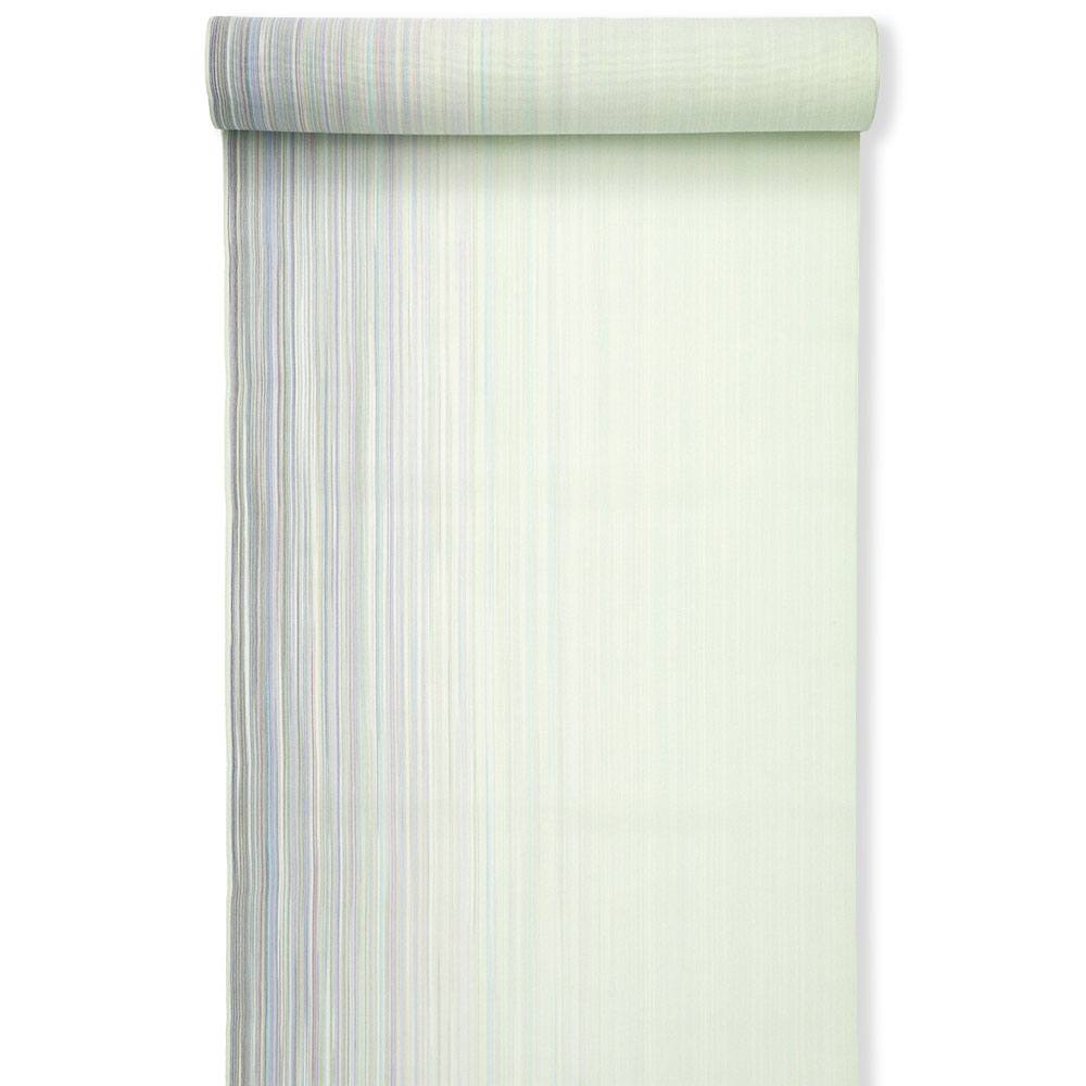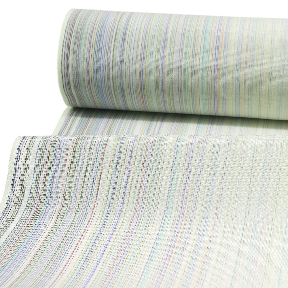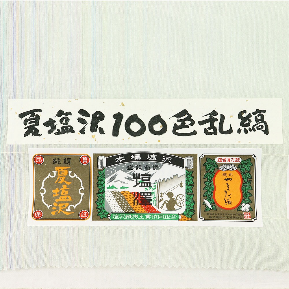 『100色乱縞』の名の通り、様々な色の糸を用いて片身に乱縞を表現。透き通るような薄緑色の地に彩りを加えた雅なデザインに、夏塩沢の風合いで、夏の着姿を粋に、風流に演出します。