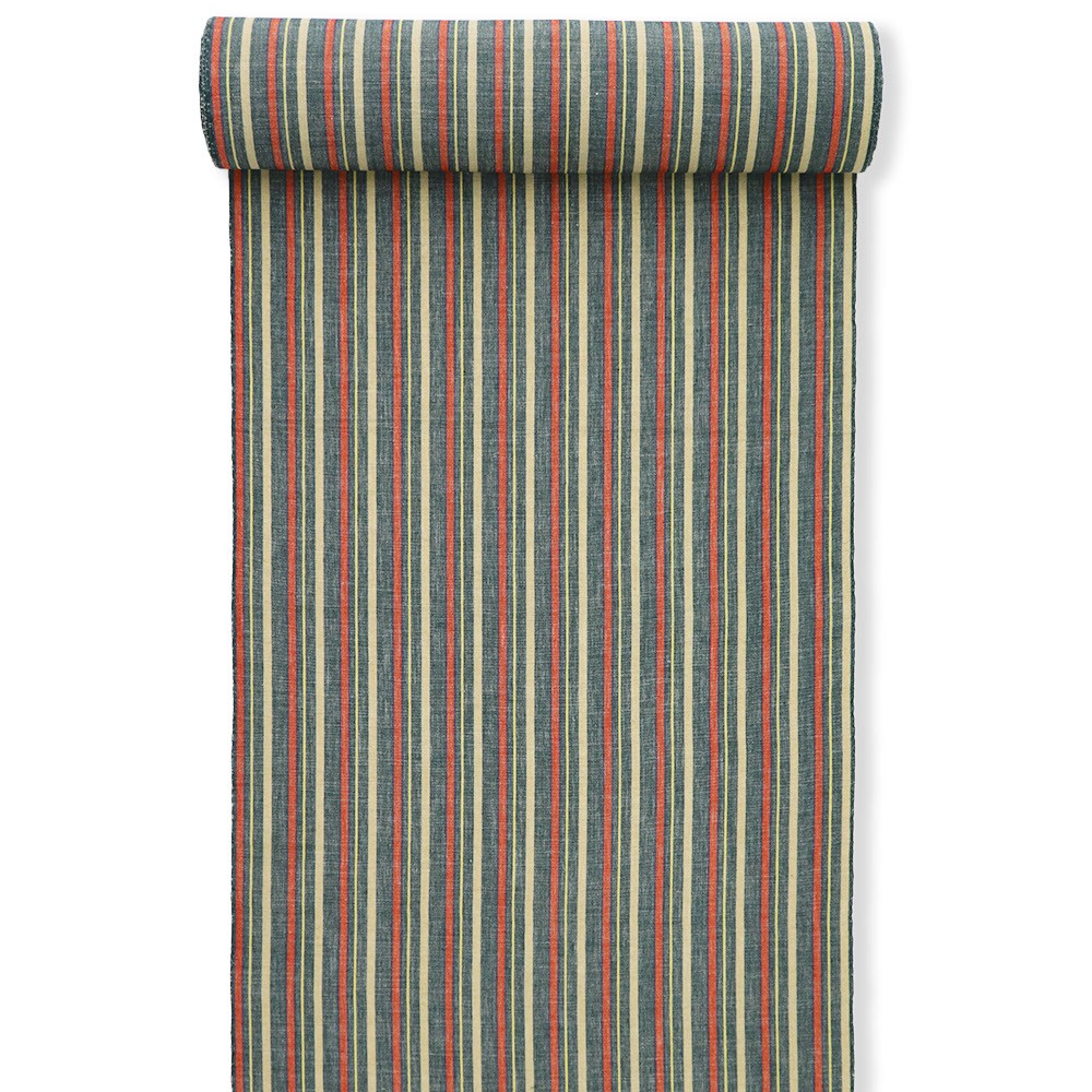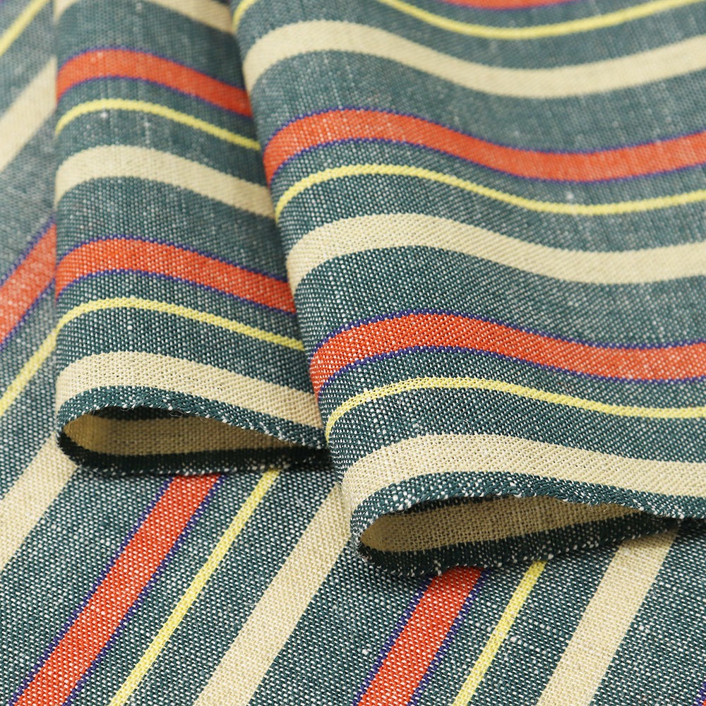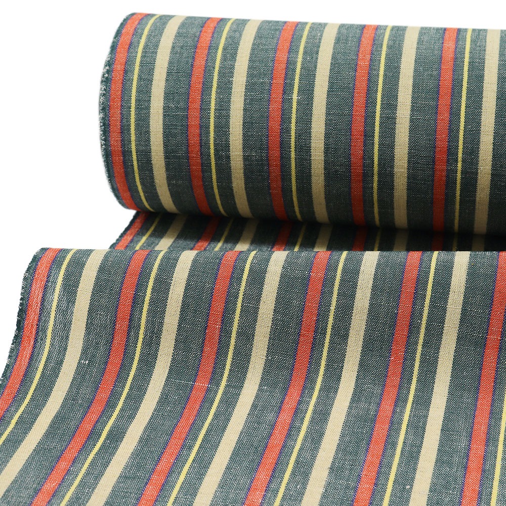 風合いにこだわった糸と、表現性を重視した美しい色合いが、池沼織工房が織る木綿の特徴です。こちらは、緯糸が綿麻になっているので、綿100%と比べて少しだけ軽い肌触りに。緑×赤の縞模様のハーモニーも、風合いと同時にお楽しみください。