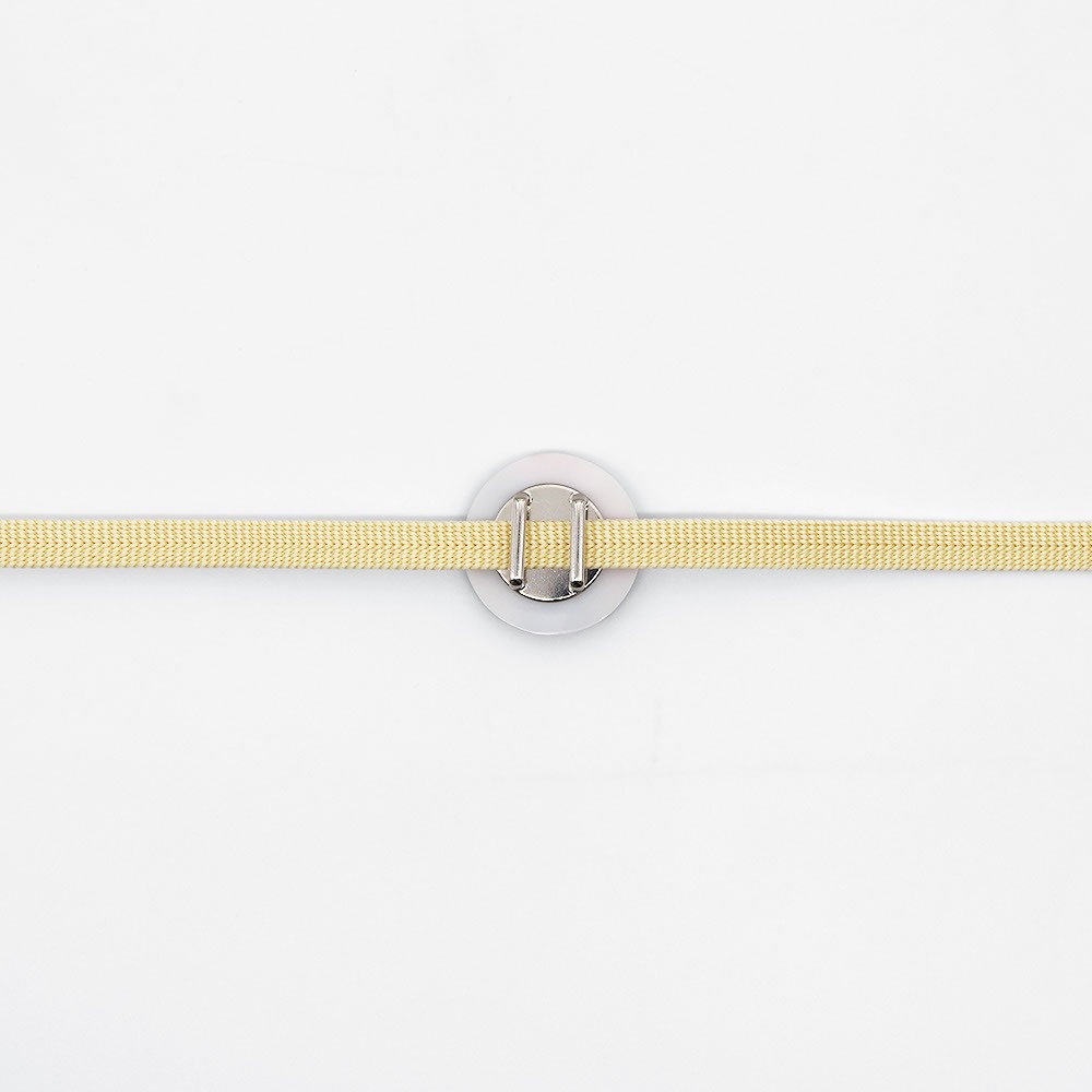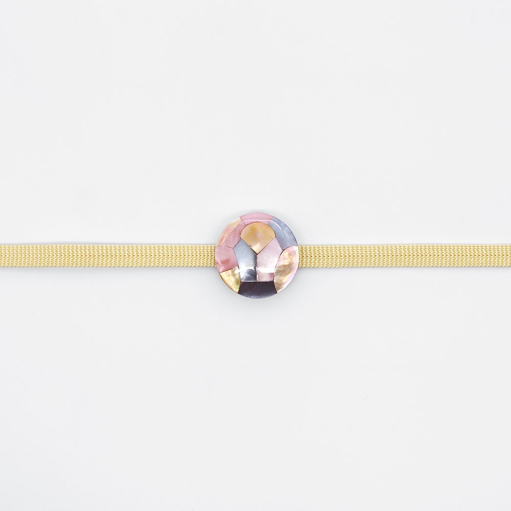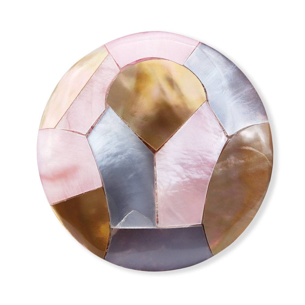 色合いや光沢が異なる貝でモザイクのような幾何模様を表現。抽象的なデザインと柔らかな色彩が、神秘的で気品あふれる仕上がりになっています。様々なコーディネートに馴染み、帯元でさりげなくその個性を発揮してくれるでしょう。