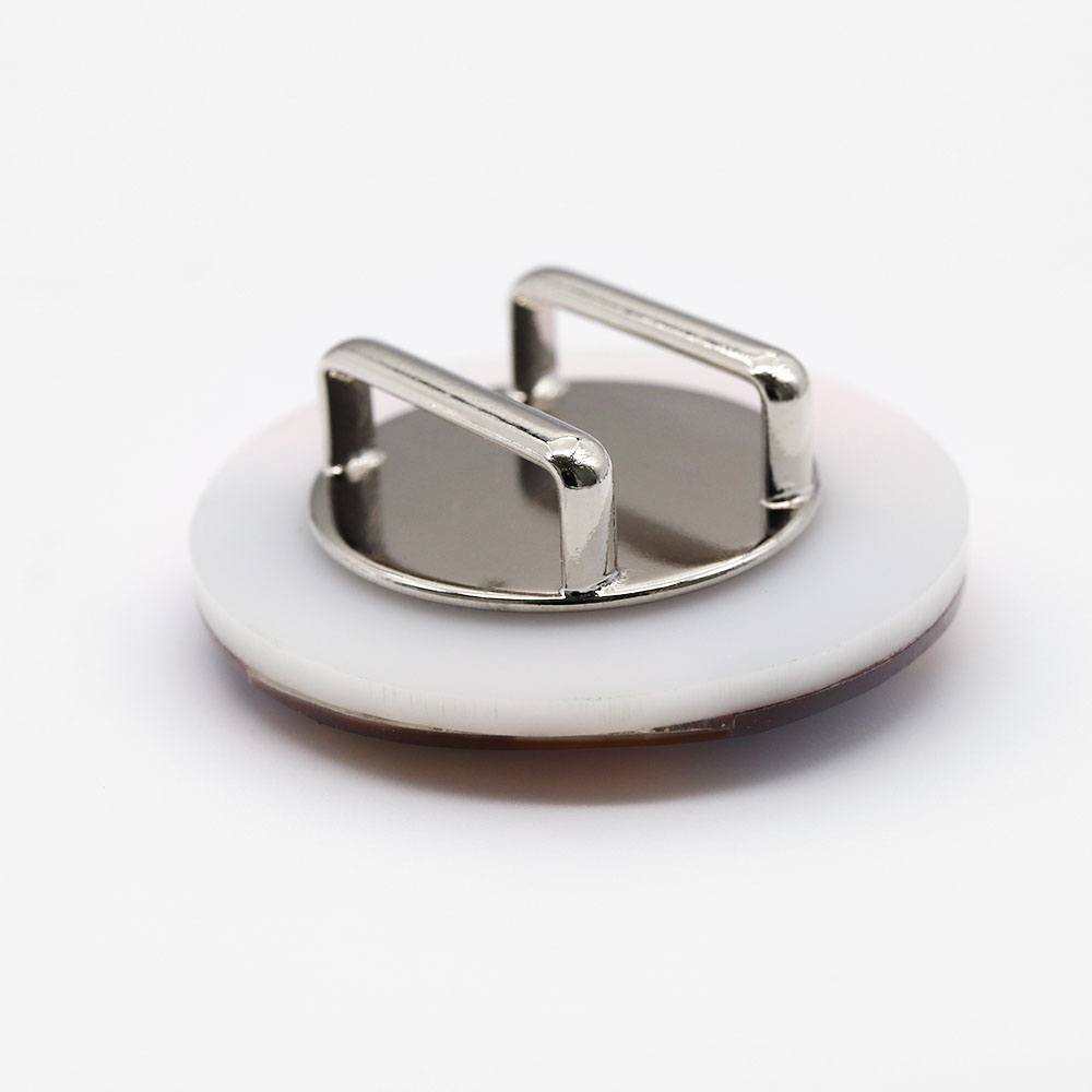 貝を使用し、温もりがあふれるアイテムを創り出す【リオン工芸】による、ラウンド型の貝帯留。