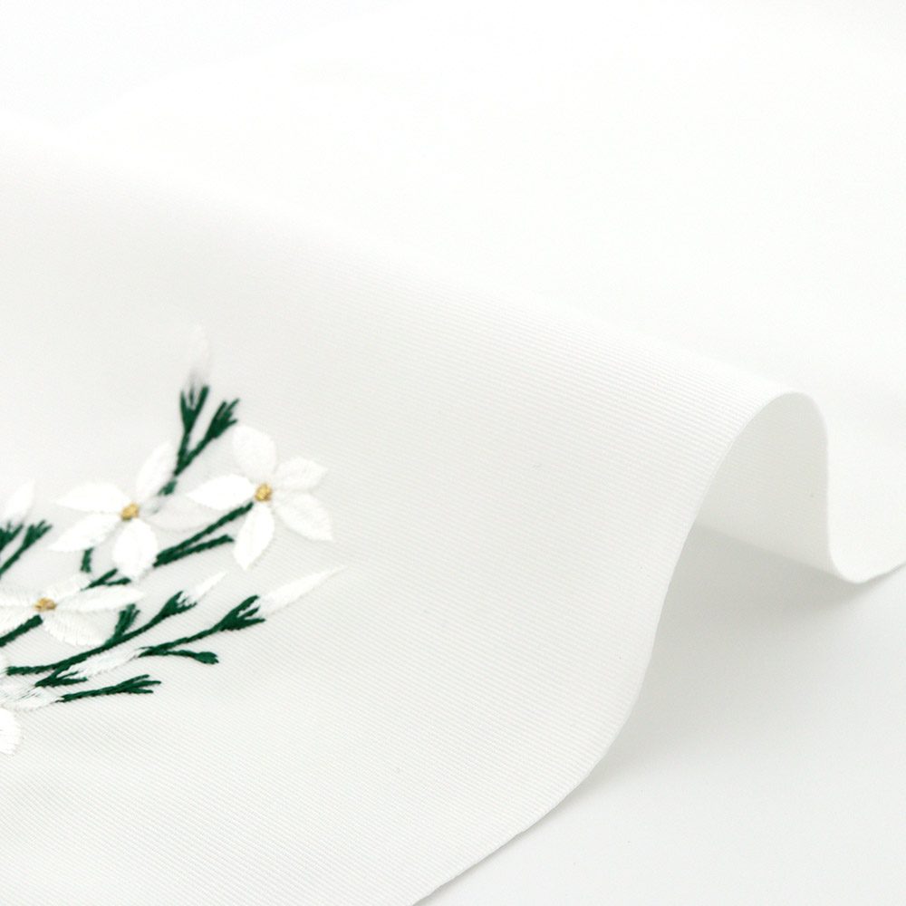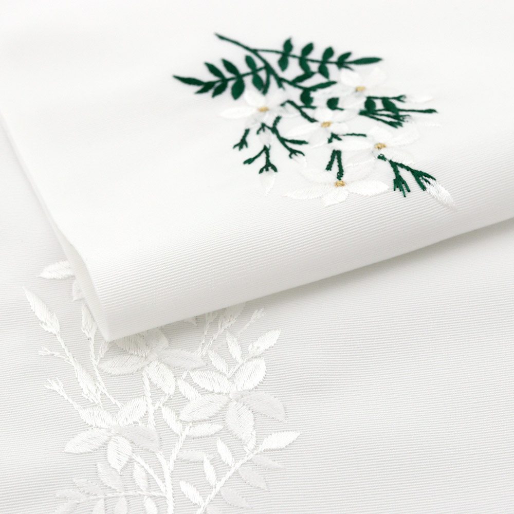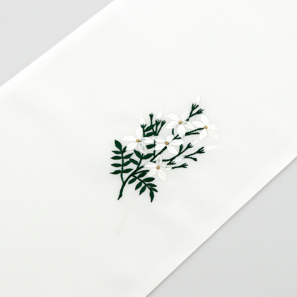 やや地厚で塩瀬のような横畝(うね)が清楚な生地に、ジャスミンの刺繍を施した一枚。