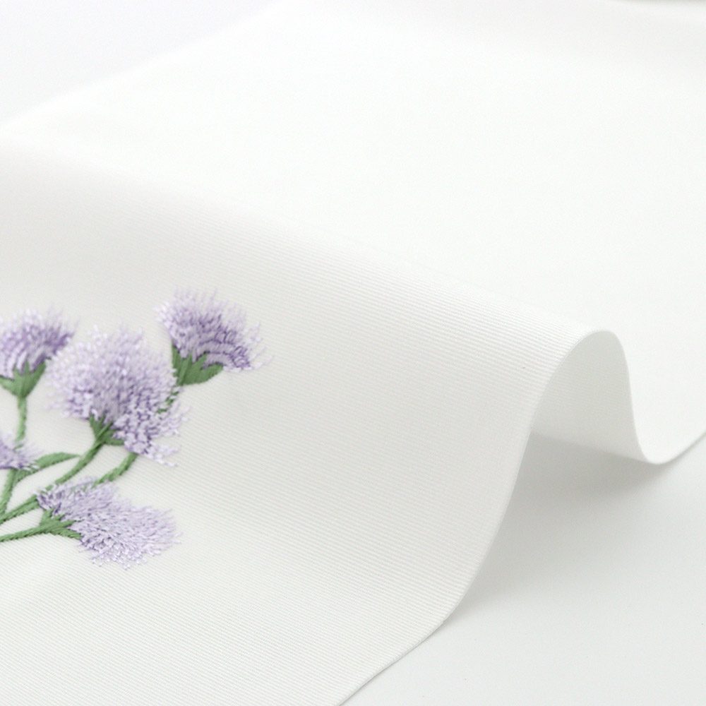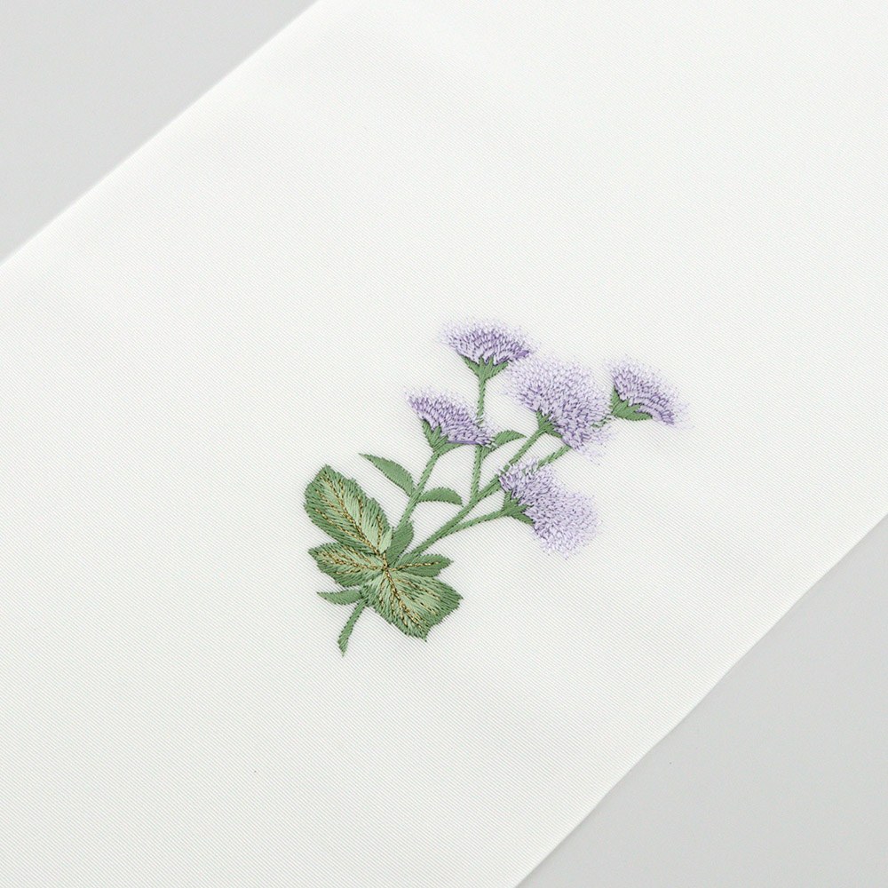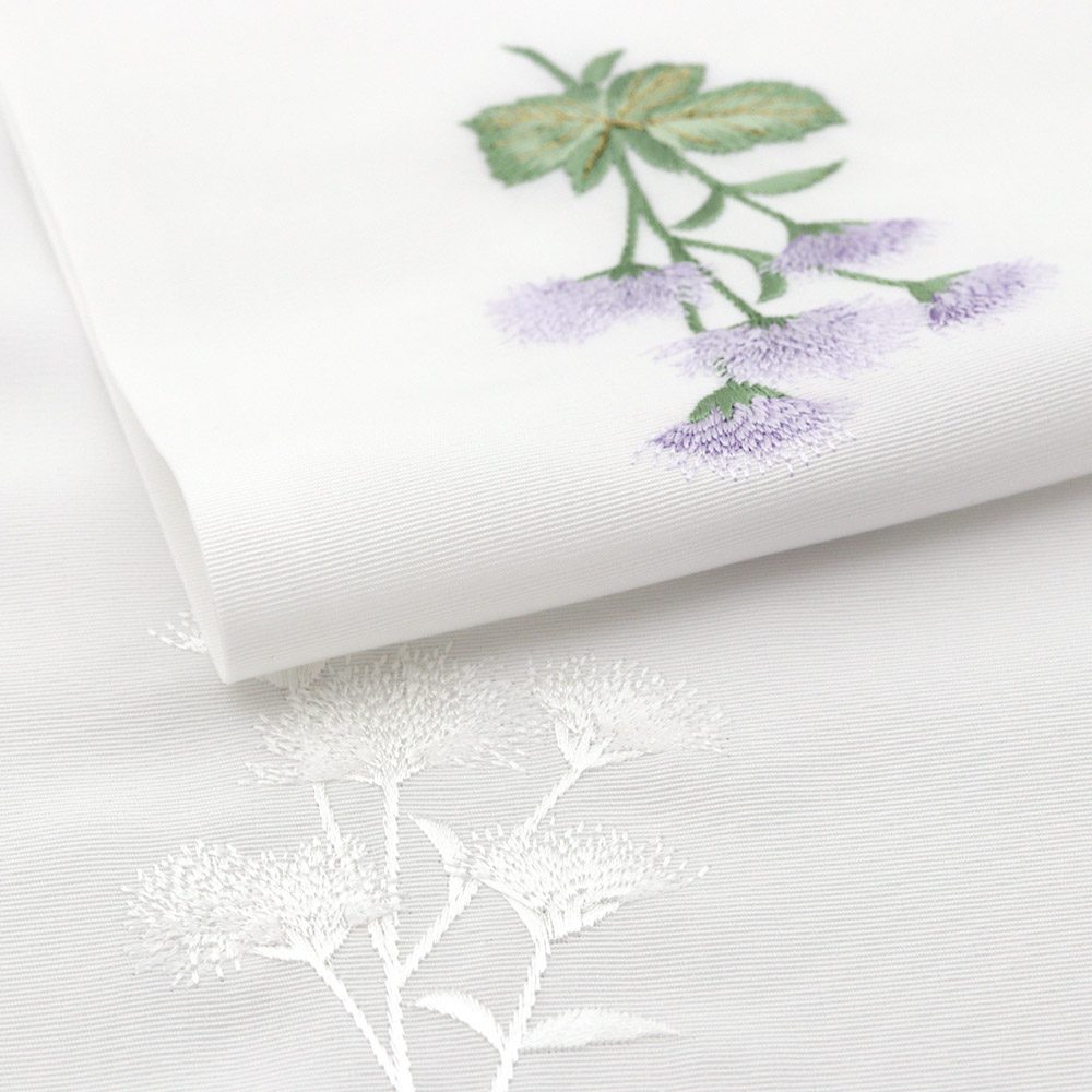 やや地厚で塩瀬のような横畝(うね)が清楚な生地に、ミストフラワーの刺繍を施した一枚。