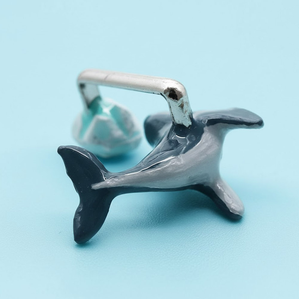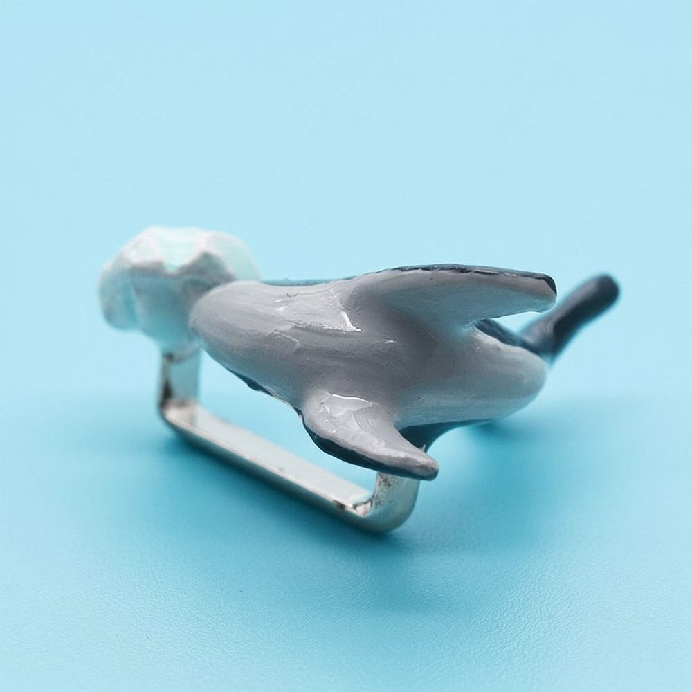 こちらは、氷で遊んでいるクジラがモチーフです。尾ひれの形やお腹の畝まで細かく造形されており、ハイクオリティな仕上がり。真鍮の質感もあいまって、可愛らしいモチーフでも高級感はバッチリです。