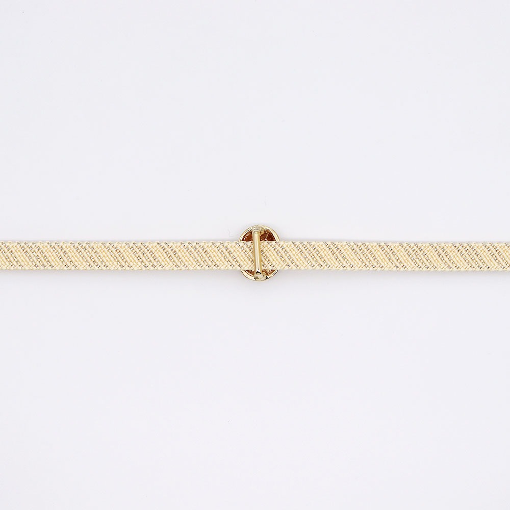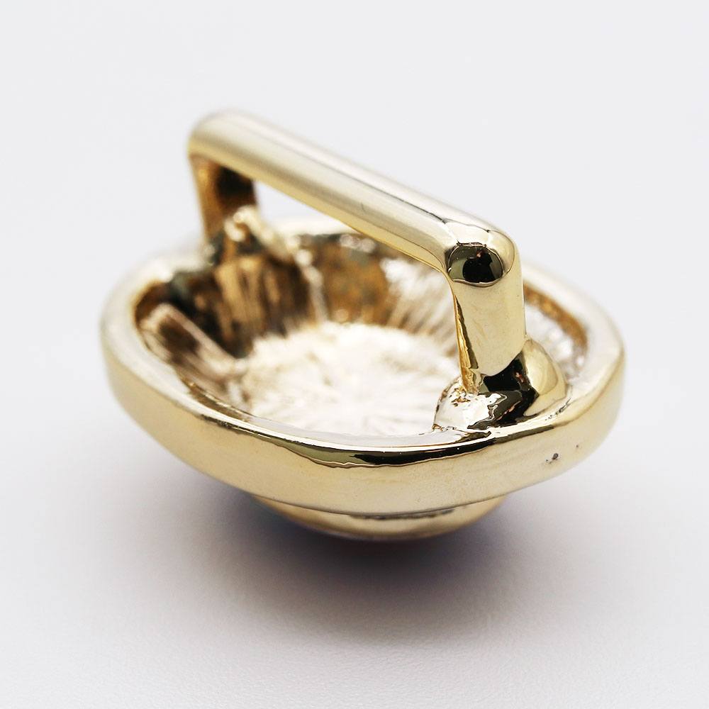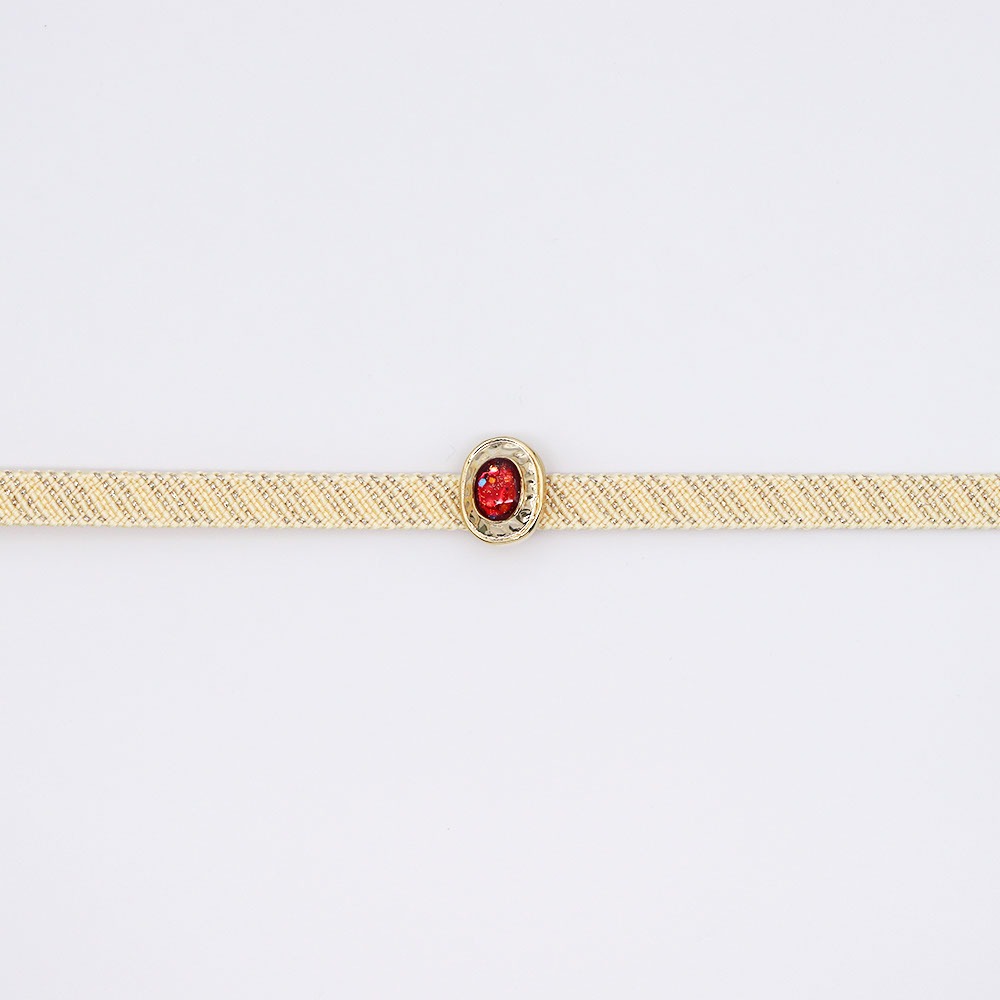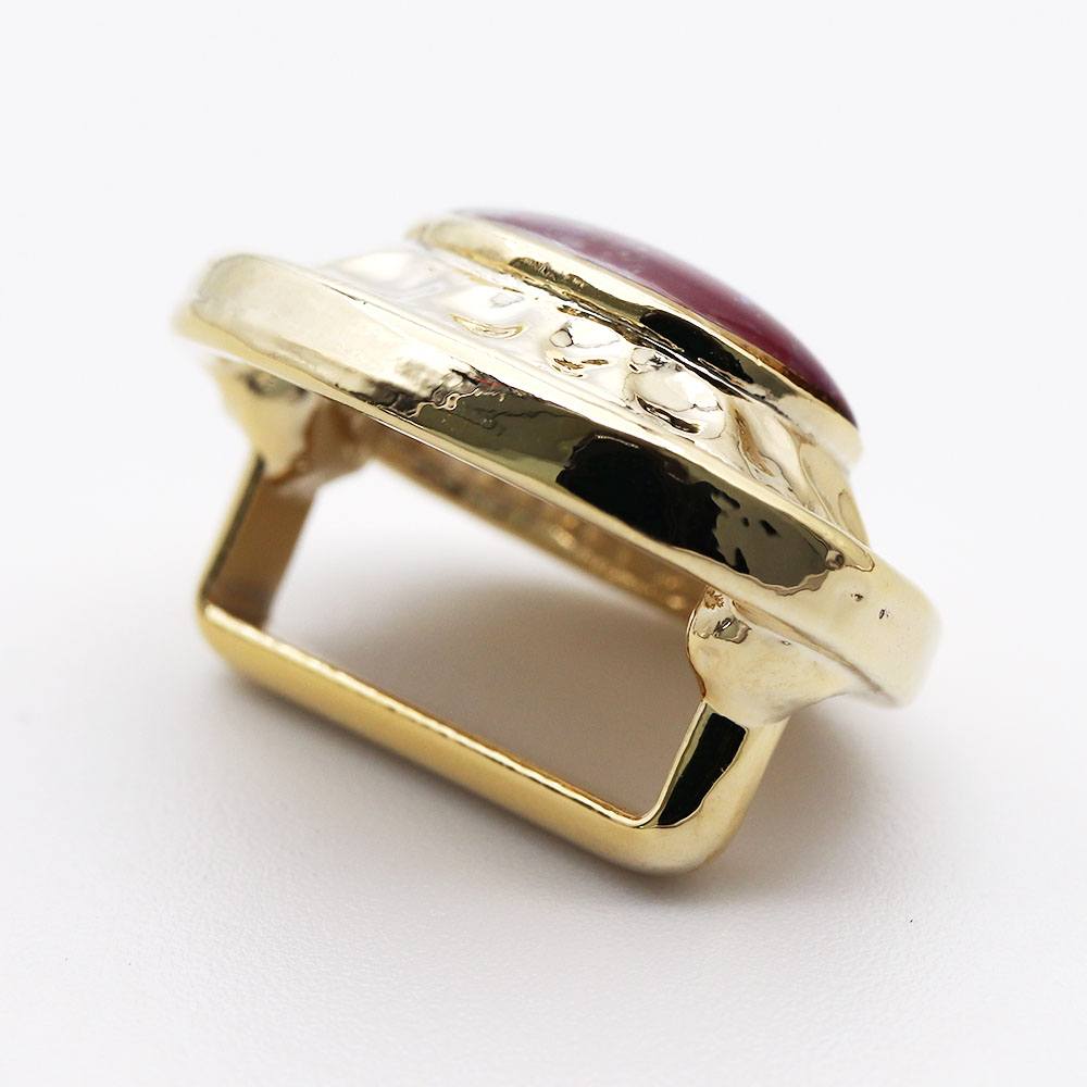 ルビーを基調に、グリーンやイエローが見え隠れする鮮やかなデザイン。真鍮の台座にのせられた立体的なフォルムが、腹前のアクセントとして活躍します。