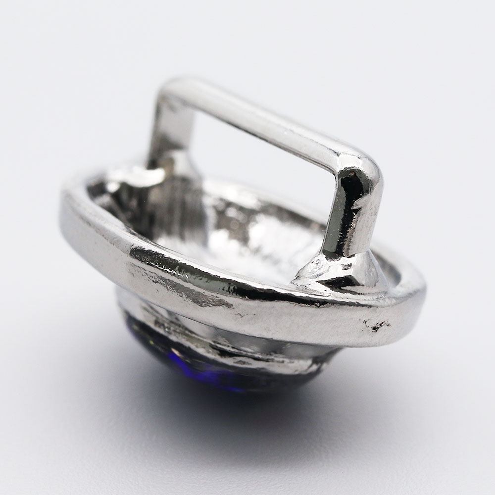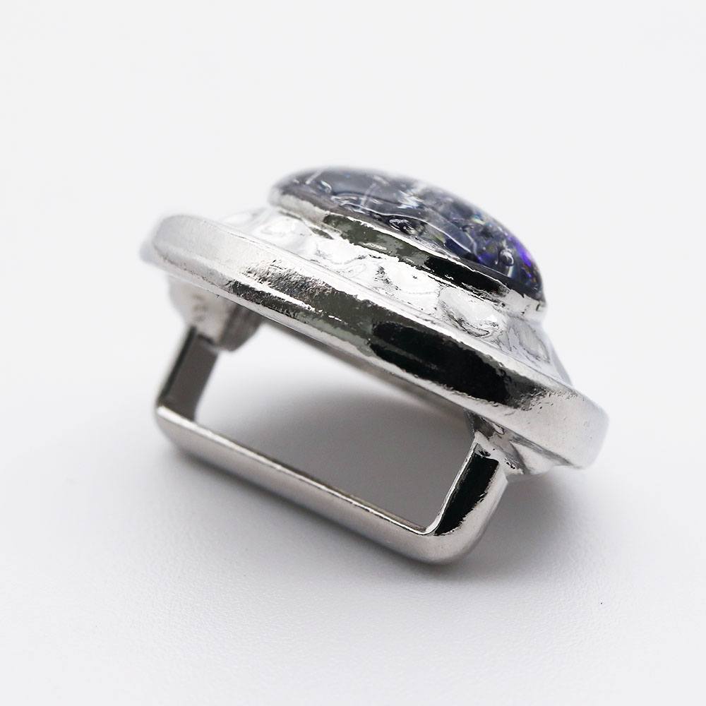 アメジストを基調に、ブルーやグリーンが見え隠れする鮮やかなデザイン。真鍮の台座にのせられた立体的なフォルムが、腹前のアクセントとして活躍します。
