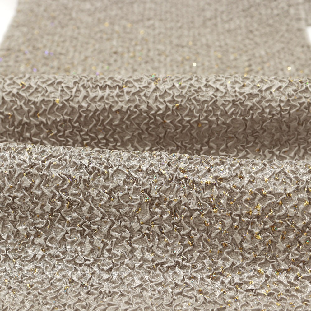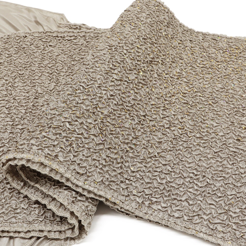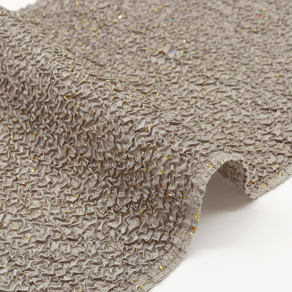 シボのボリュームと伸縮性に富んだ生地は薄く軽やかな風合いで、重いと思われがちなポリエステルのイメージを払拭するような仕上がりです。