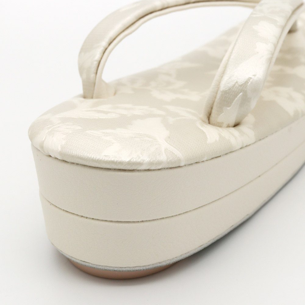 レザー調の浅いシボが入った芯を重ねた草履台に、アラベスク柄の草履天を合わせた一足。