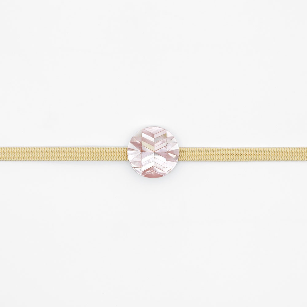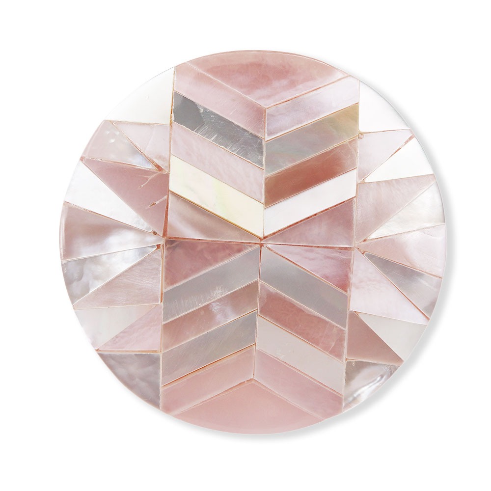 色合いや光沢が異なる貝を細長く切り出し、北欧デザインを想起させる星模様を表現。異なる色合いのピンクやホワイトを並べ、繊細な柄行きと輝きを楽しめるデザインになっています。