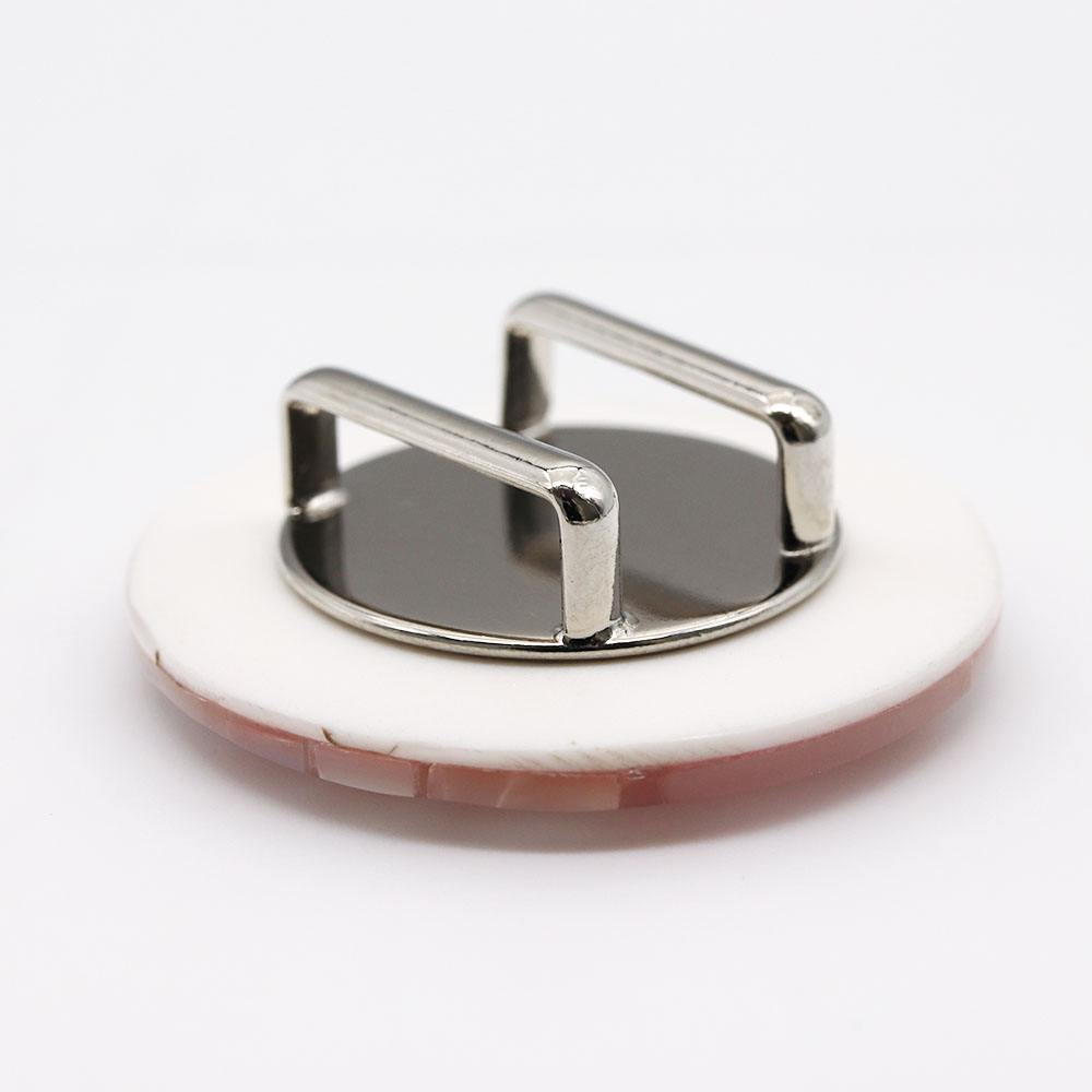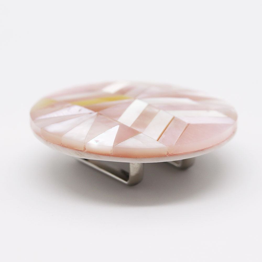 貝を使用し、温もりがあふれるアイテムを創り出す【リオン工芸】による、ラウンド型の貝帯留。