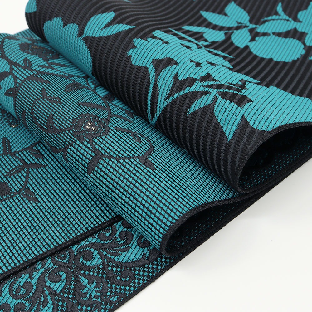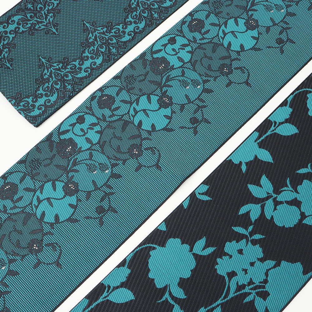 特筆すべきは表面に2パターン(花輪/シルエット)、裏面に1パターン(レース調)の3デザインが織りあげられていること。表面の2パターンは帯の真ん中で切り替わっており、巻き初めによって異なる柄出しを楽しめる、3WAY仕様になっています。