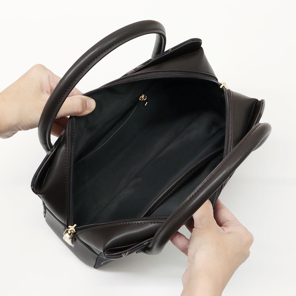 デザインには裏表がなく、ダブルファスナーなので左右どちらからでも開閉でき、利き手や利き腕に左右されずに持つことができます。内ポケットはファスナー付きとオープンポケットが付いており、用途に合わせて小物を整理できるのもポイント◎底面には底鋲が4つ付いており、自立してバッグ本体を傷から守ります。専用の不織布袋もついているので、ぜひ収納時にご活用ください。