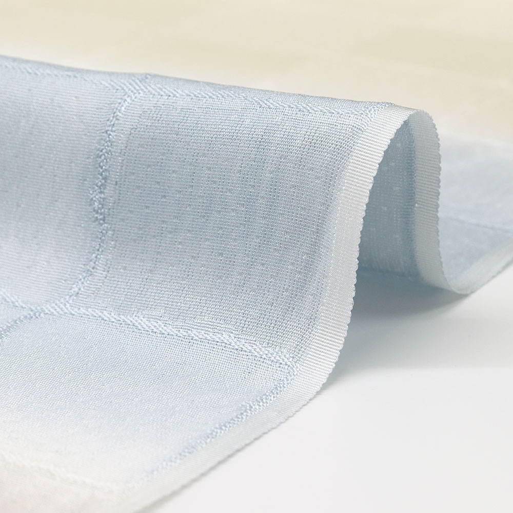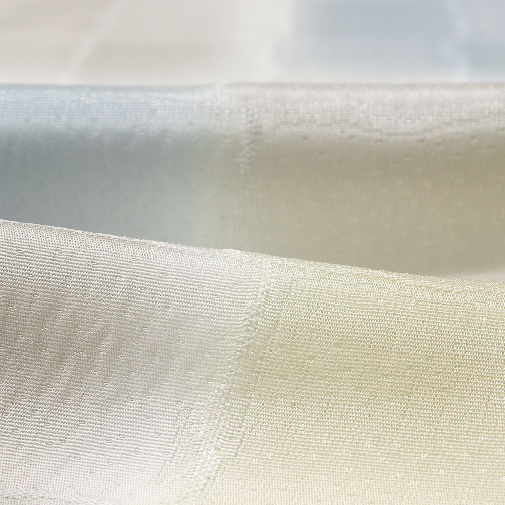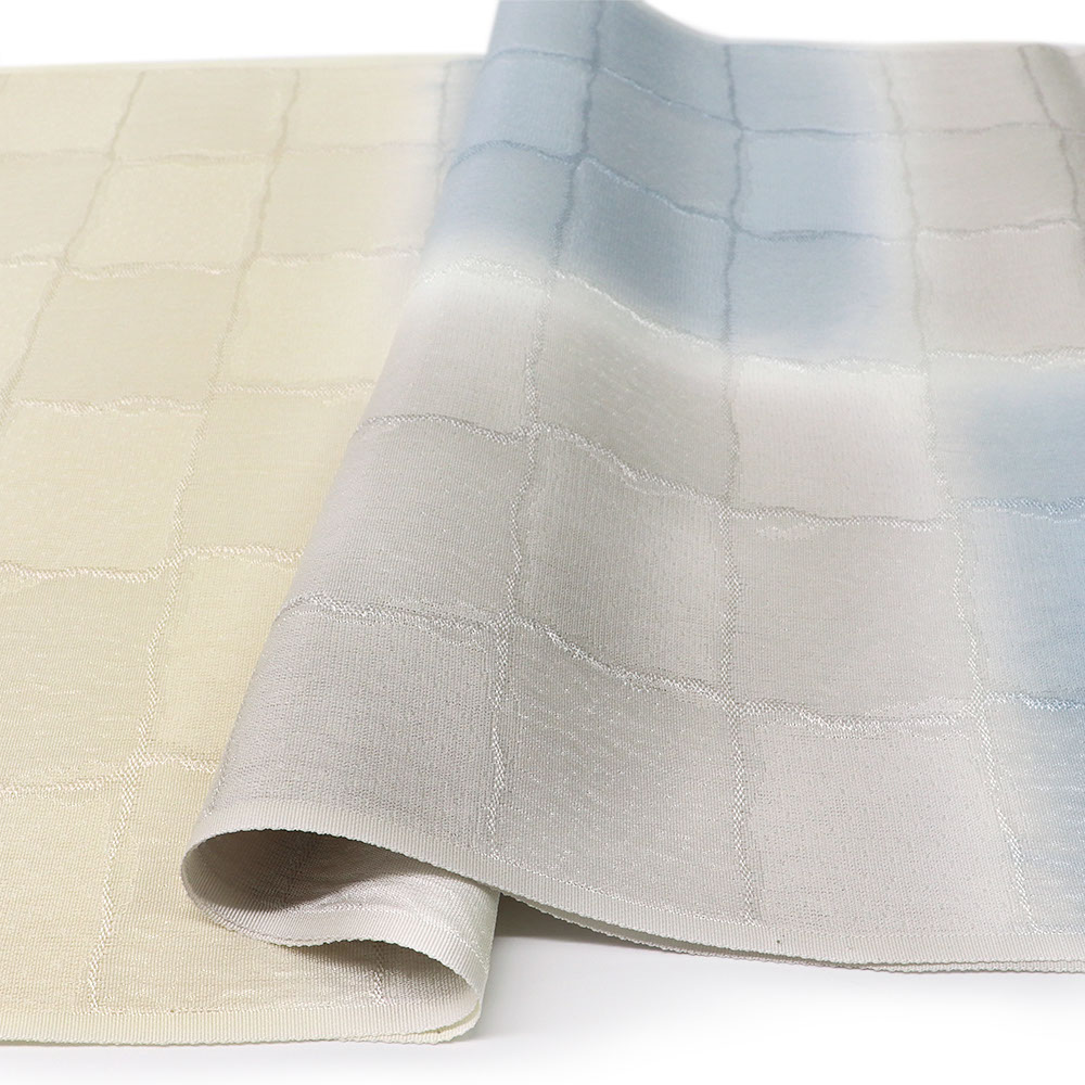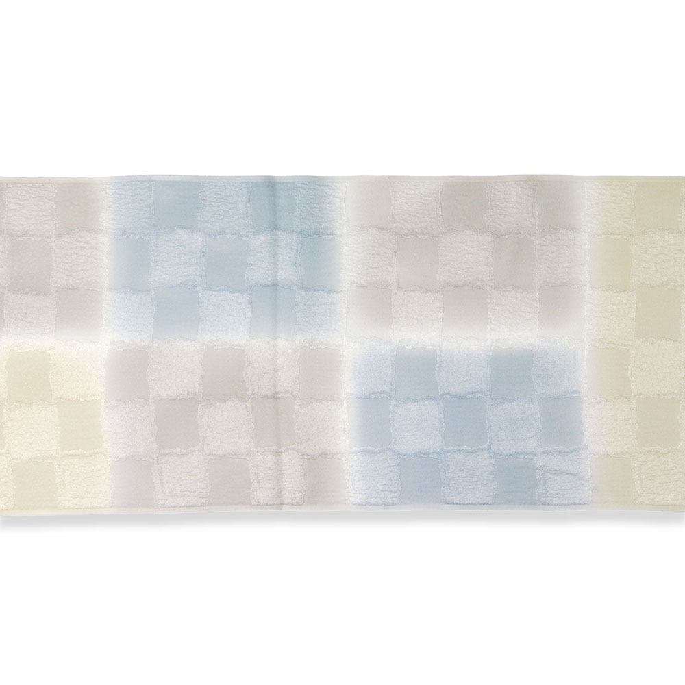 美しい光沢と陰影を生み出す市松地紋に、ぼかしで市松模様を表現した一枚。薄青や薄灰を基調にした淡い色合いが、帯周りからコーディネートを優しく支えてくれるデザインです。
