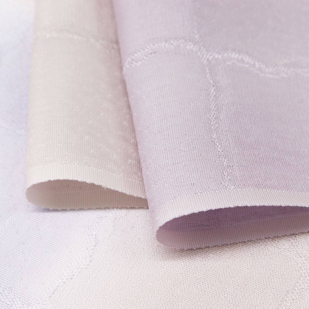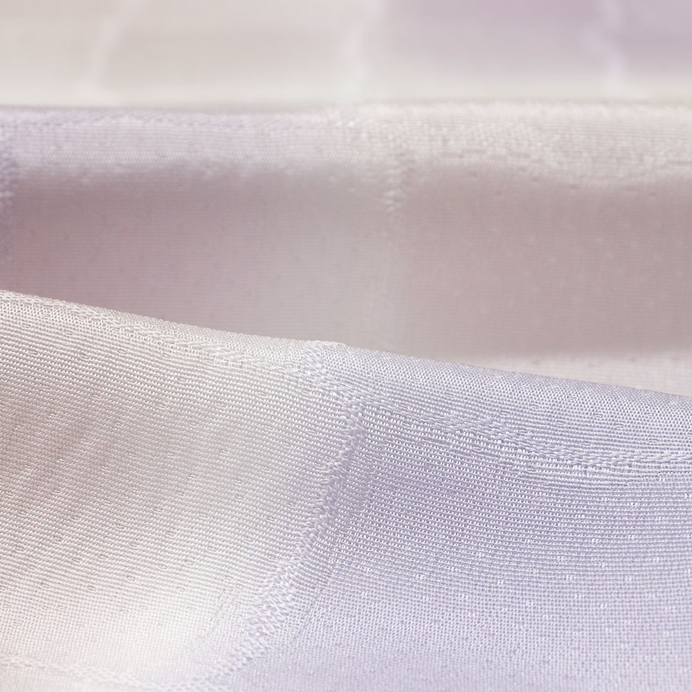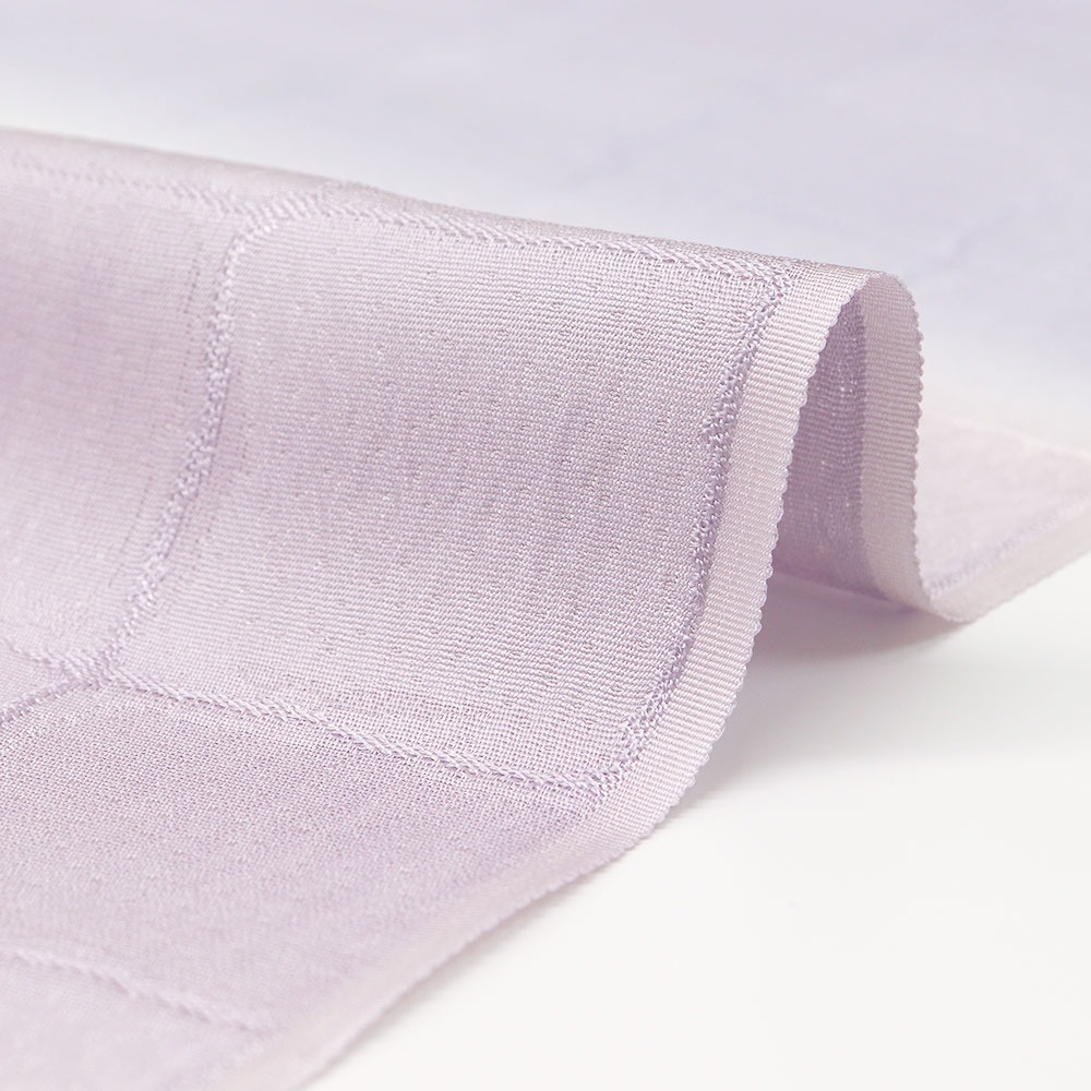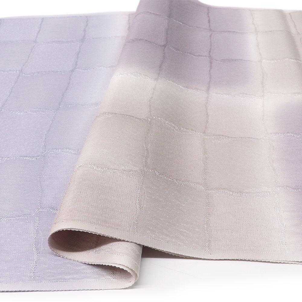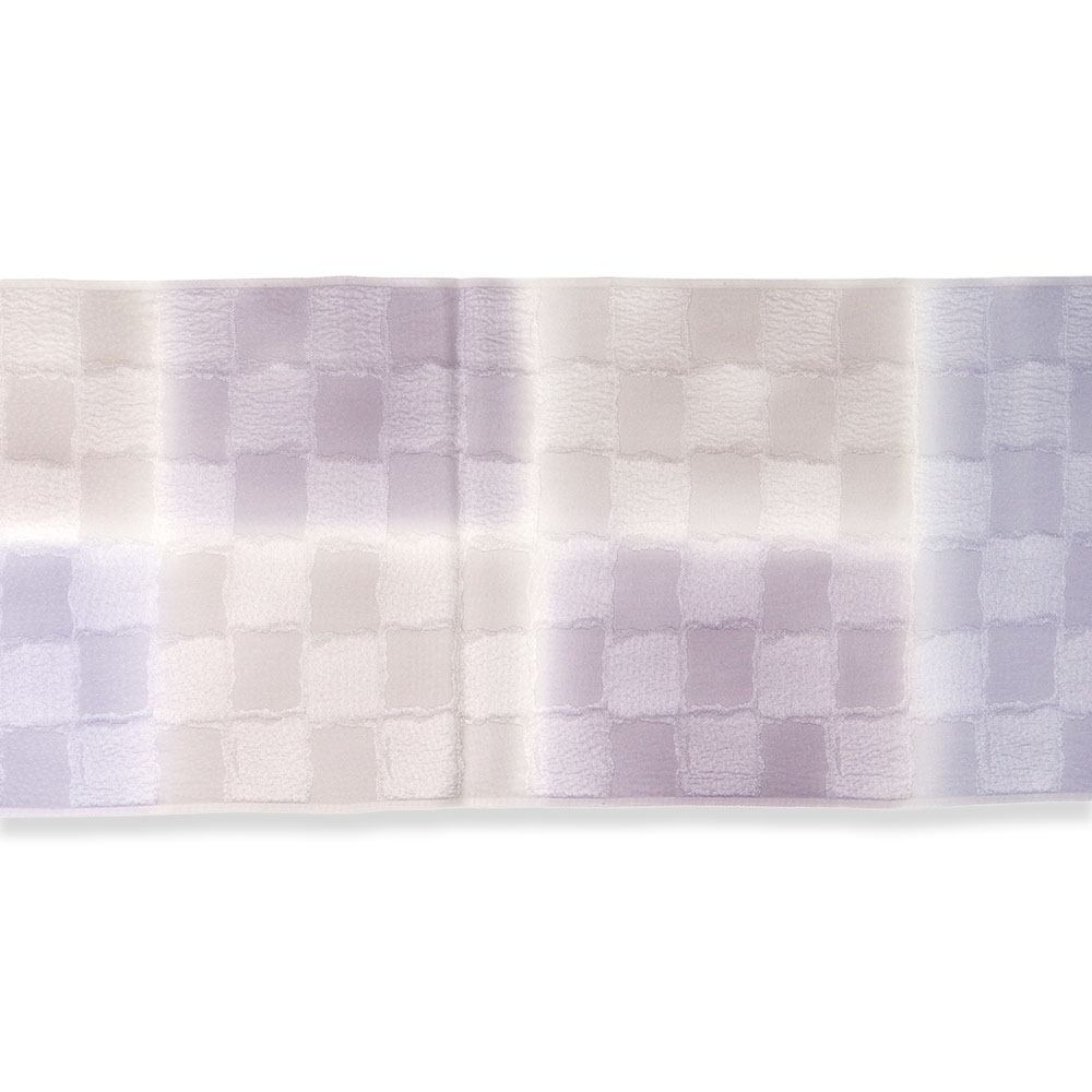 美しい光沢と陰影を生み出す市松地紋に、ぼかしで市松模様を表現した一枚。薄紫や薄藤を基調にした淡い色合いが、帯周りからコーディネートを優しく支えてくれるデザインです。